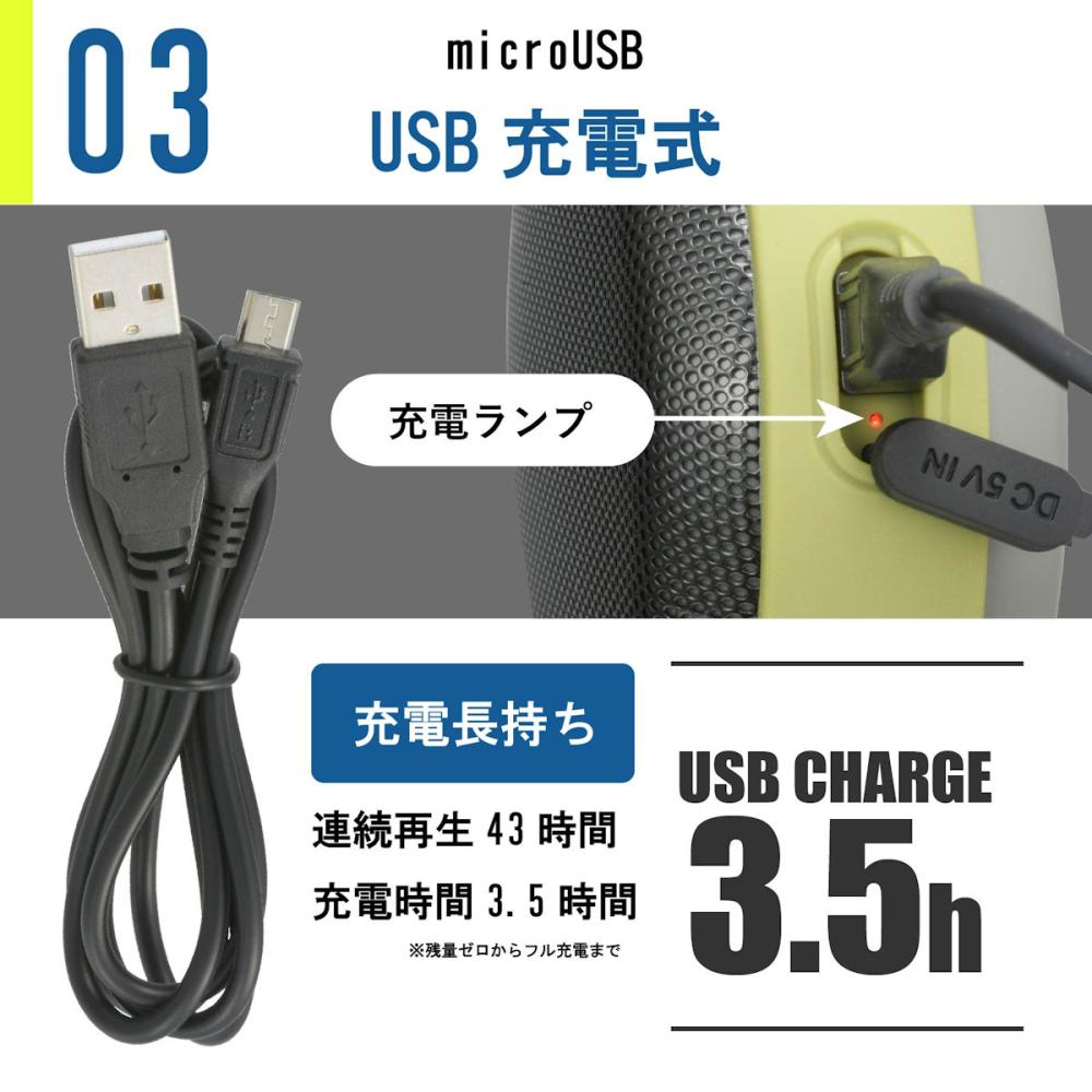 ■ 電源:DC5V(USB給電:microUSB入力端子) ■ 内蔵バッテリー:充電式リチウムポリマー電池(3.7V 880mAh) ■ 実用最大出力:3W ■ 再生周波数帯域:150Hz~17KHz ■ スピーカー:口径40mm(2オーム)フルレンジスピーカー×1 ■ SN比:≧80dB ■ 防水性能:IPX6(耐水形)…いかなる方向からの水の強い直接噴流によっても有害な影響を受けない ※JIS C 0920:2003(IEC 60529:2001)による ※完全防水ではありません。 ■ 通信方式:Bluetooth標準規格 Ver.5.1 ■ 対応プロファイル:A2DP、AVRCP ■ 変調方式/周波数帯域:GFSK/2.402~2.480GHz ■ 最大通信距離:見通し約10m(Class2) ■ 充電時間:約3.5時間(残量ゼロからフル充電まで) ■ 音楽再生可能時間:約43時間(50%音量) ■ 動作環境:温度…0~40℃、湿度…20~80%(結露なしにて) ■ 外形寸法:幅85.5×高さ89×奥行41.5mm(突起物、ハンドベルトを除く) ■ 質量:約115g ■ 付属品:専用充電コード、ハンドベルト(本体に装着済み)、保証書、取扱説明書
