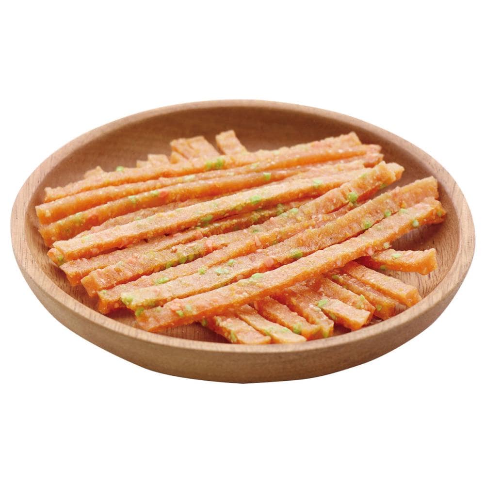 原材料・成分:肉類(鶏ササミ・鶏)、とうもろこし、米粉、食塩、にんじん、ほうれん草、殺菌乳酸菌(プラズマ乳酸菌)、ソルビトール、グリセリン、リン酸塩(Na)、着色料(クチナシ・ベニコウジ色素)、調味料(アミノ酸)