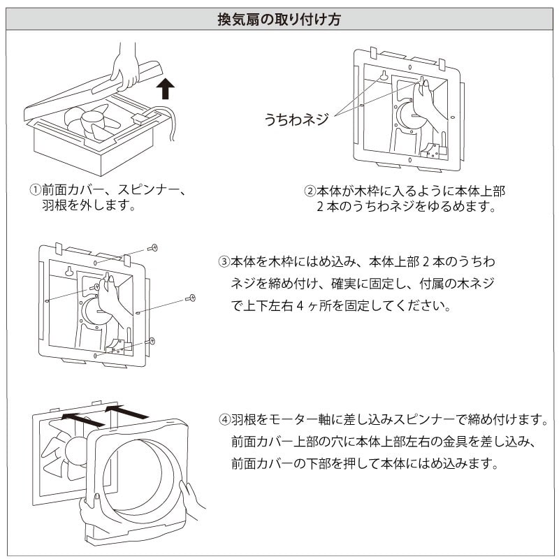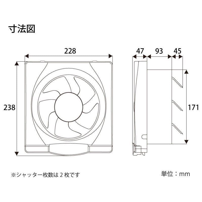"・ハネ径:15cm ・シャッター枚数:2枚 ・定格電圧:100V ・定格周波数:50/60Hz ・消費電力(50/60Hz):22/24W ・風量(50/60Hz):4.5/4.5m³/min ・騒音(50/60Hz):46/44dB"