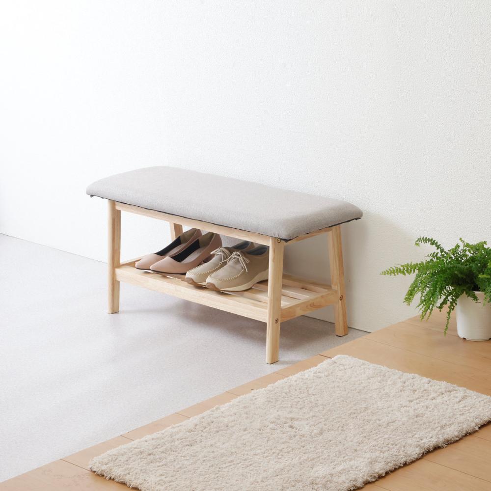 ゆっくり腰をかけて靴の脱ぎ履きができます。棚付きだから小物も置けて便利。