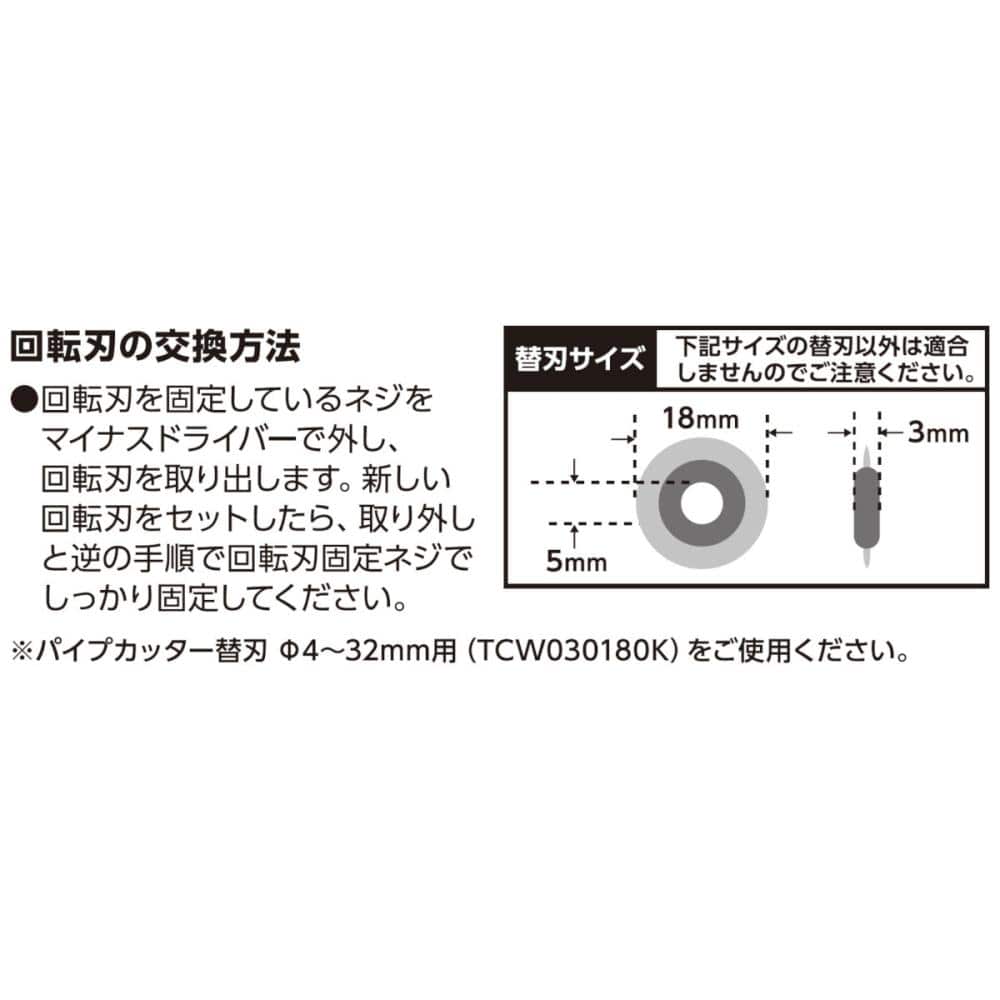 ※パイプカッターの替刃は4~32mm用 (TCW030180K)をご使用ください。 【使用上の注意】 ・刃部は鋭利に仕上げておりますので刃部に触れないでください。刃の交換や 保管の際にも十分に注意してください。 ・切断時にハンドルを強く締めすぎると刃の損傷やパイプの変形の原因となり ますのでご注意ください。 ・シャフトの摩耗を防ぐため、カッターとローラーのシャフトに油をさして ください。 ・本品を本来の目的以外には絶対に使用しないでください。