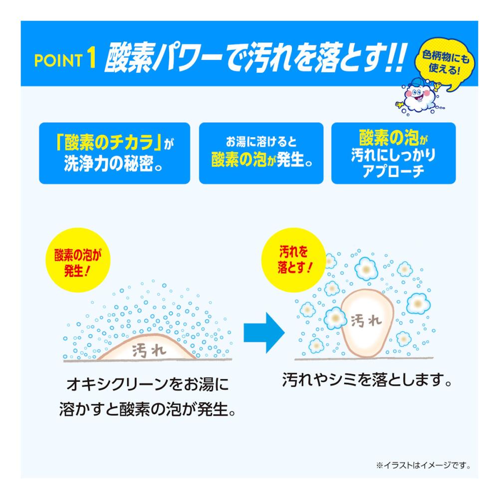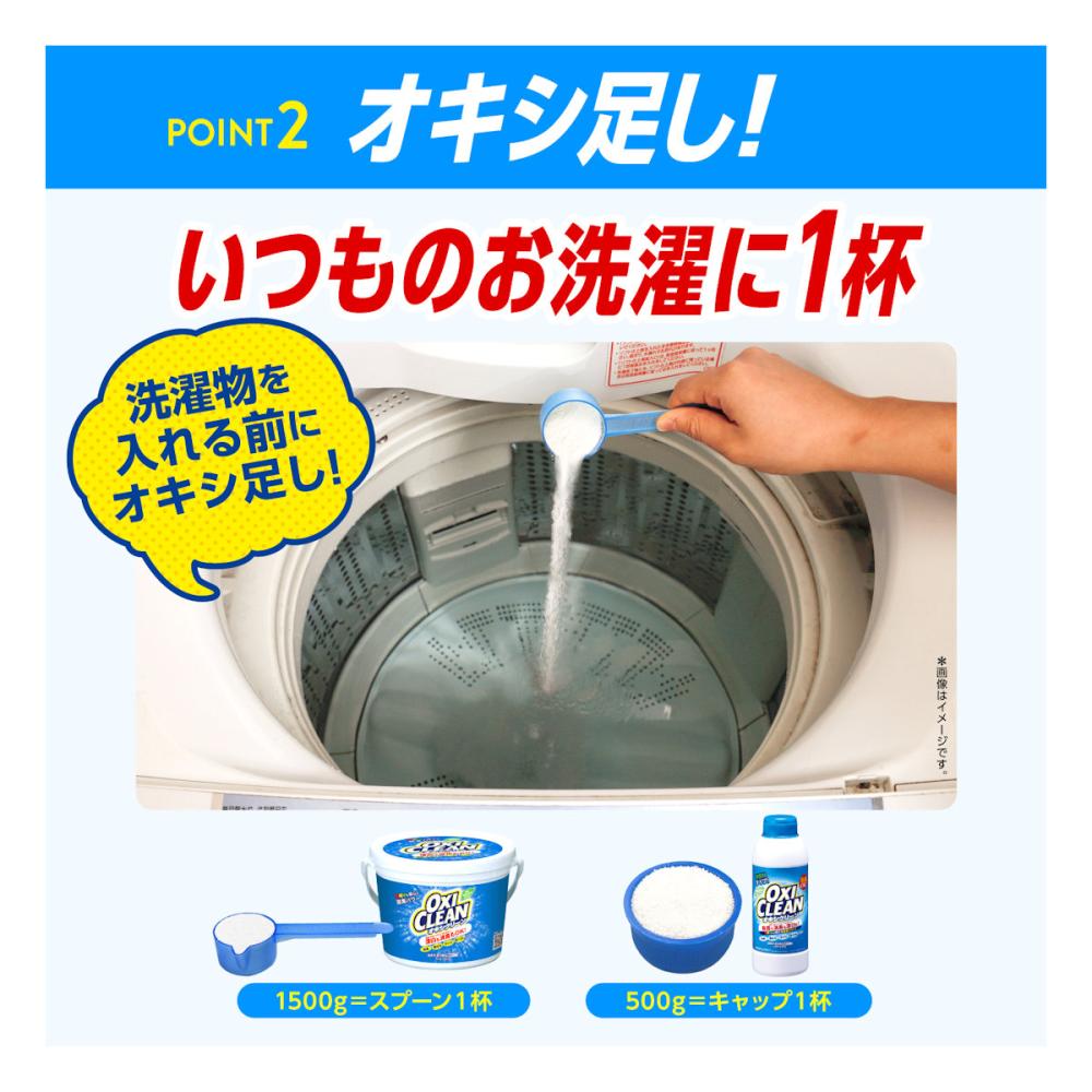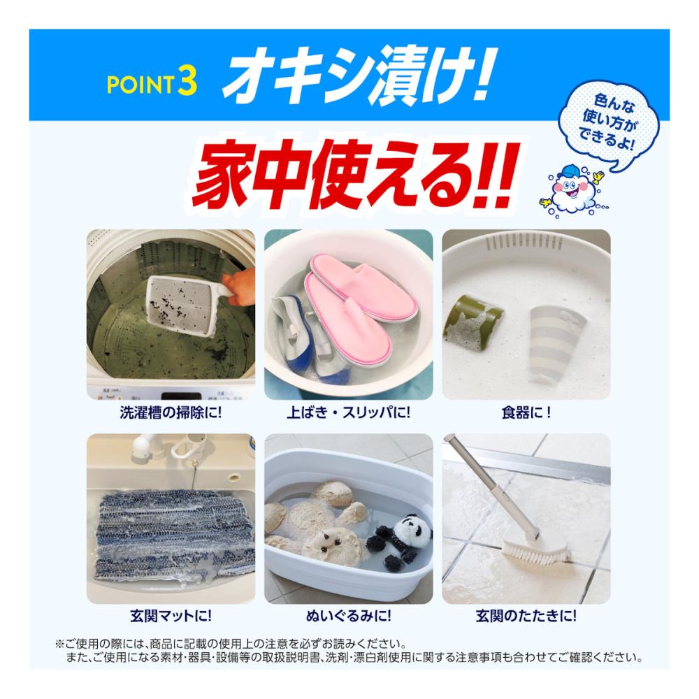 オキシクリーンは色々な使い方で活躍します。 ◎オキシ漬け◎ オキシクリーン溶液に漬けおき。頑固な汚れの運動靴、洗濯槽、カーテンなどにも。 ◎オキシ足し◎ 日々のお洗濯にひとさじ足すだけ。気になるニオイに。 ◎オキシこすり◎ オキシクリーンでこするだけ。浴室やベランダの汚れに。