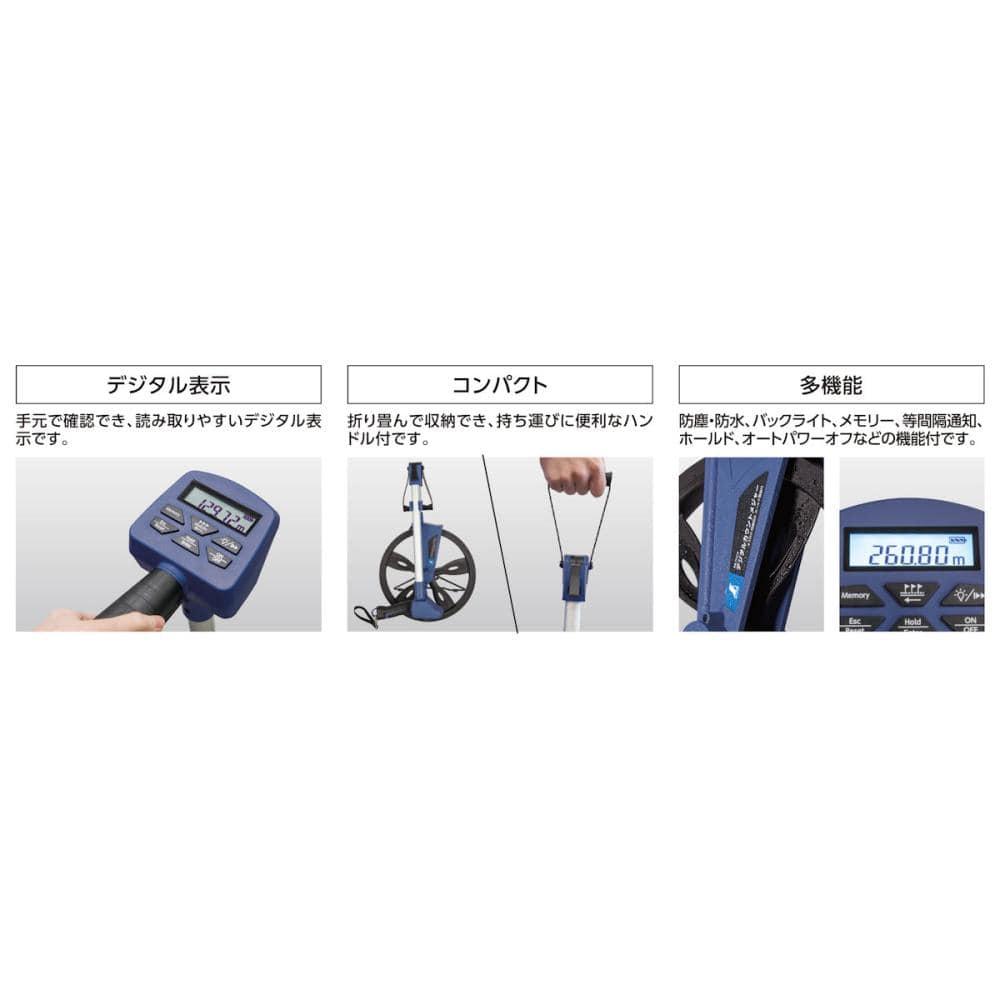 "車輪が大きいため安定した測定ができます。 アナログタイプよりも読み取りやすい、バックライト機能付の大型・大文字・手元ディスプレイです。 メモリー機能で測定値を100件まで保存可能です。 測定値をホールドし、液晶の見えにくい状況でも数値が確認できます。 設定した距離毎に音で知らせる等間隔通知機能付です。"