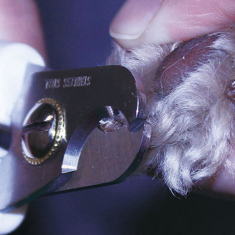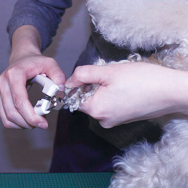 ■爪切りを持ち、あいている手でペットの足首をやさしく握ります。※足先を持ち上げるときは、関節が自然に曲がる方向を理解し、無理な方向に曲げないでください。