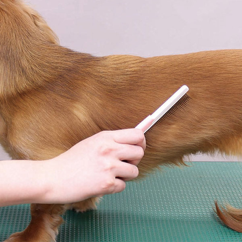 (2)次に細目側に持ちかえて同様にとかします。顔や耳、飾り毛も。