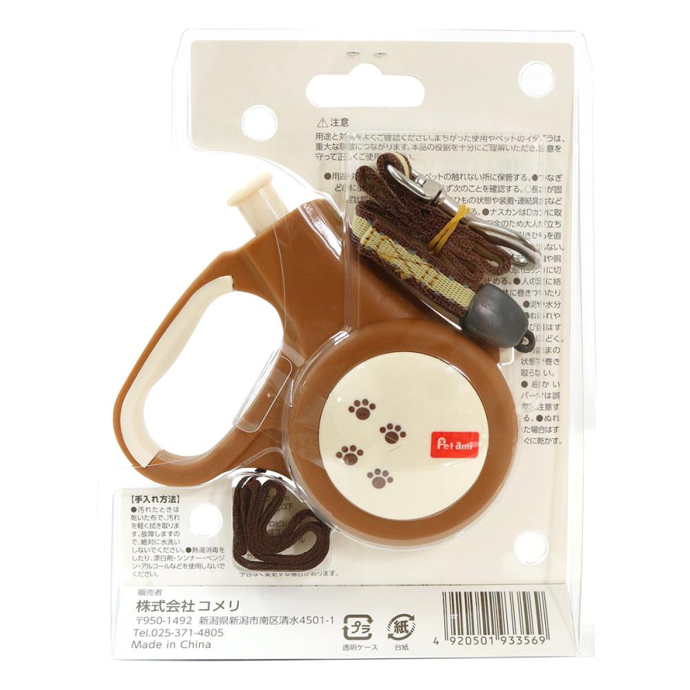 お取り扱い上の注意:●使用前に必ず取扱説明書をお読みください。まちがった使用やペットのイタズラは、重大な事故につながります。本品の役割を十分にご理解いただき、注意を守って正しくご使用ください。 ●用途・対象を守る。 ●幼児やペットの触れない所に保管する。 ●つなぎどめに使用しない。 ●使用前に必ず次のことを確認する。○長さが固定状態(ロック)であること○引きひもの状態や装着・連結具合など ●強度に余裕のあるものを使用する。 ●ナスカンはDカンに取り付ける。 ●子供が使用する場合は、安全のため大人が立ち会う。 ●摩擦によるケガ・ヤケドを防ぐため、引きひもを直接持ったり、引きひもの出入り口に指をかけたりしない。 ●自動巻き取り状態(フリー)での使用時に首輪や胴輪が外れたときは、直ちに固定状態(ロック)に切り替えて巻き取りを止める。 ●人の足に絡まったり、ペットの首や体に巻きついたりしないように注意する。 ●泥や水分はすぐに拭き取る。 ●ねじれや結び目はすぐにほどく。そのままの状態で巻き取らない。 ●細かいパーツは誤飲に注意する。 ●ぬれた場合はすぐに乾かす。 ●本品は犬の「散歩用伸縮リード」です。本品の役割を十分にご理解いただき、注意を守って正しく使用してください。 ●誤った使用方法や不当な分解・修理・改造などによって起こる事故につきましては、当社は一切責任を負いかねます。また、ペットの噛みつきなどによる破損につきましては、返品の受け付けをいたしかねます。