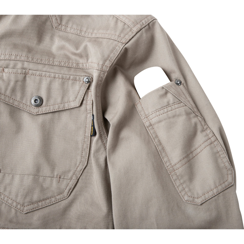 ●高級感のあるドビー織りのT/Cストレッチワークウェア。 ●ファスナーはYKKを使用、釦はレーザー彫刻を施したオリジナル四つ穴釦を使用。 ●既存アイテムと組合わせることで、年間を通してニーズに合ったコーディネートが可能。 ●男女問わず楽しめる新感覚のワークウェアです。 ●生地の横糸には、特殊な分子構造によってストレッチ性を持つTEXBRIDを使用しています。