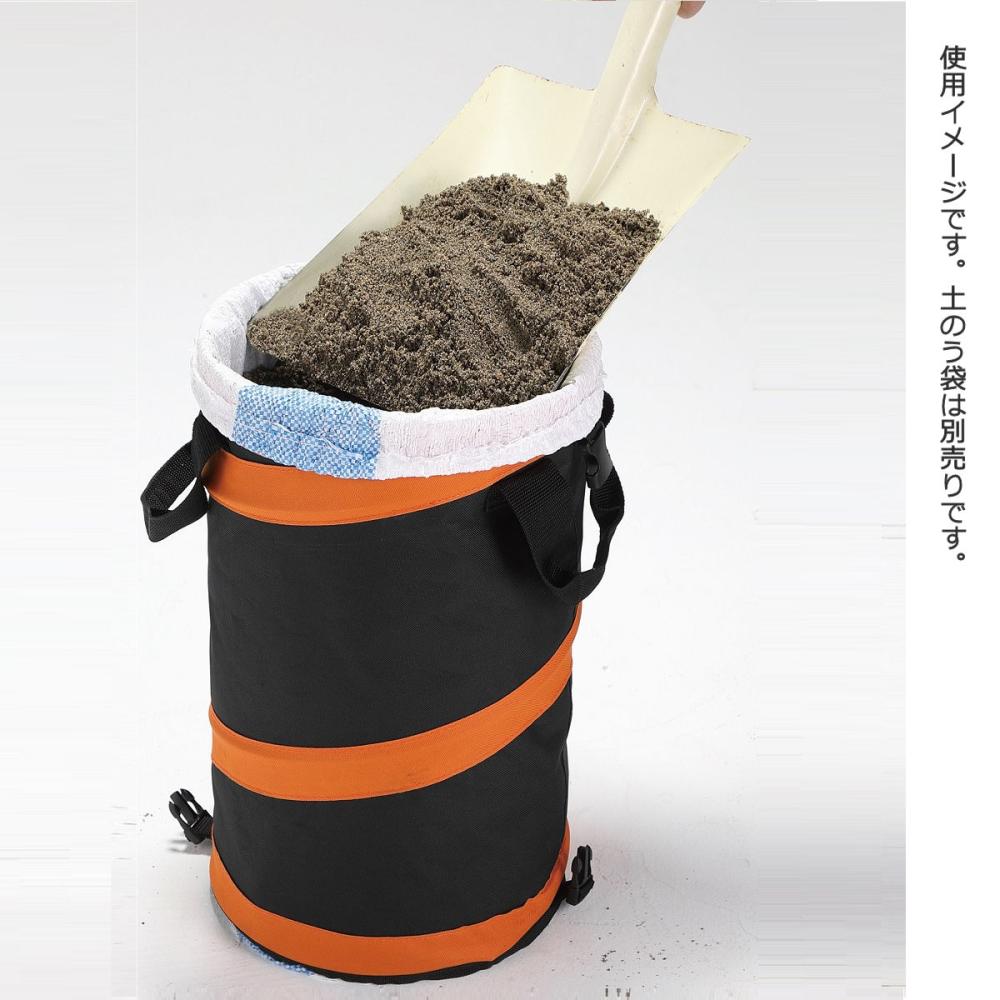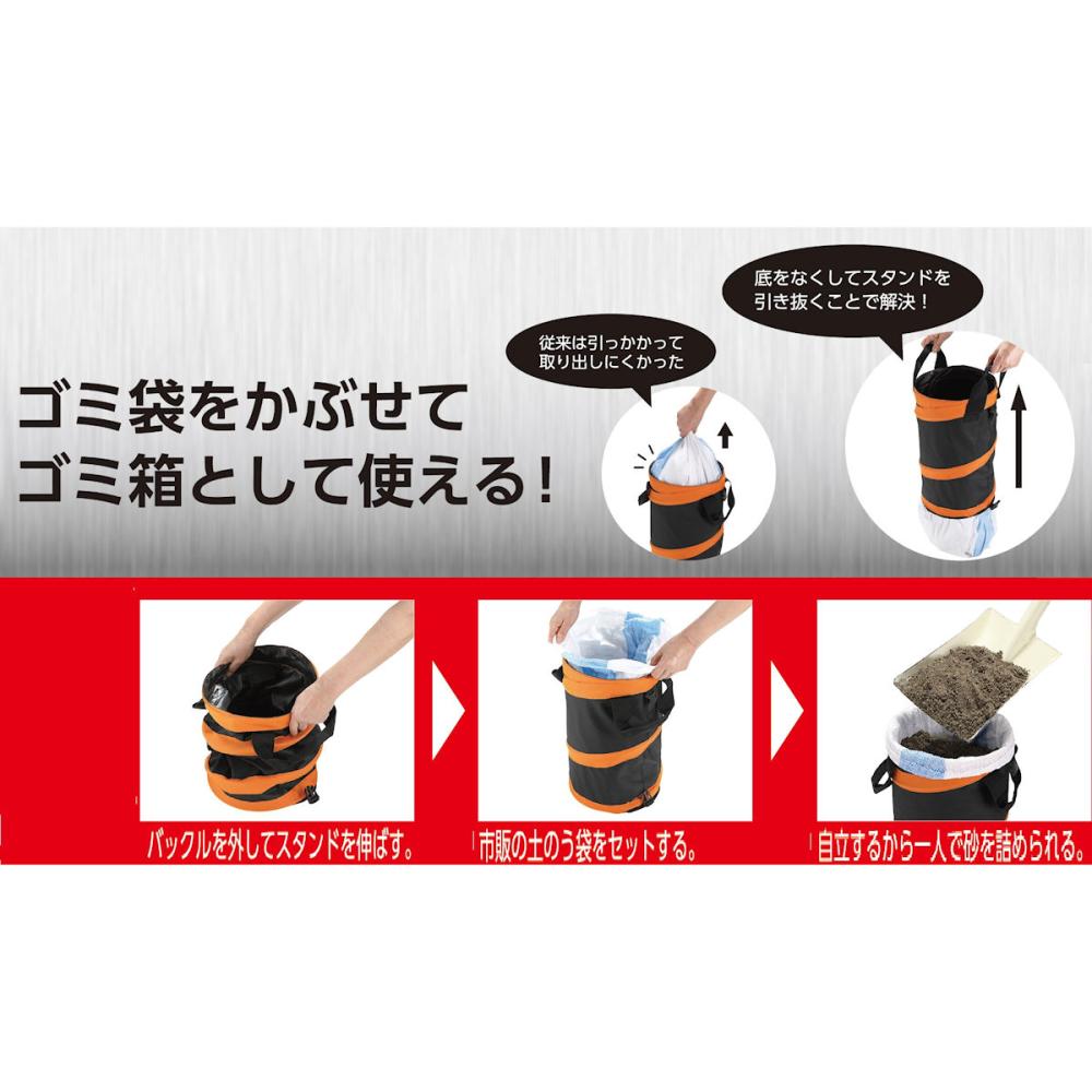 ●コンパクトに畳める事ができ、 持ち運びがしやすい。 扱いやすい筒状のスタンド。 ●内側には汚れにくいPVCコーティング付き ●土のうの充填作業が一人でできるようになり、時間短縮にも繋がります ●ゴミ袋をかぶせて、ゴミ箱として使える ●スタンドを 引き抜くことで袋の取り出しが簡単