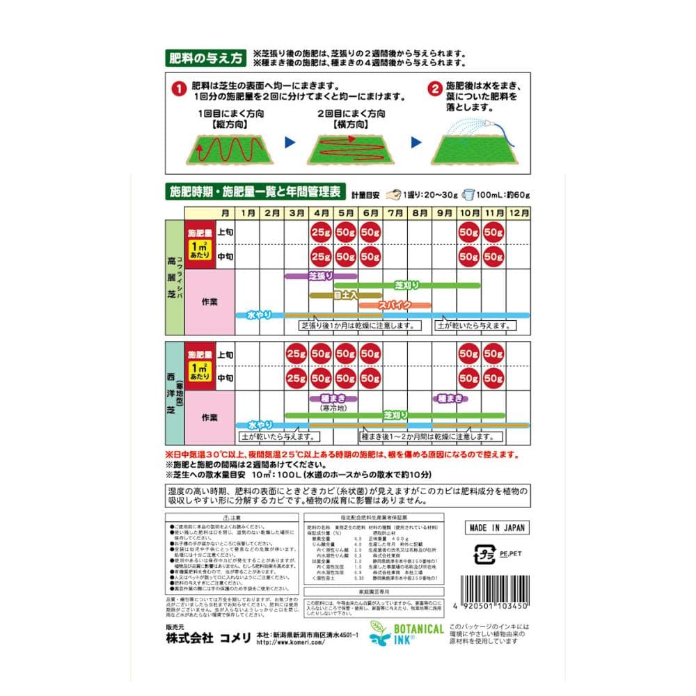 【肥料の与え方】 ※芝張り後の施肥は、芝張りの2週間後から与えられます。 ※種まき後の施肥は、種まきの4週間後から与えられます。 (1)肥料は芝生の表面へ均一にまきます。1回の施肥料を2度に分けてまくと均一にまけます(1回目縦方向、2回目横方向)。 (2)施肥後は水をまき、葉についた肥料を落とします。