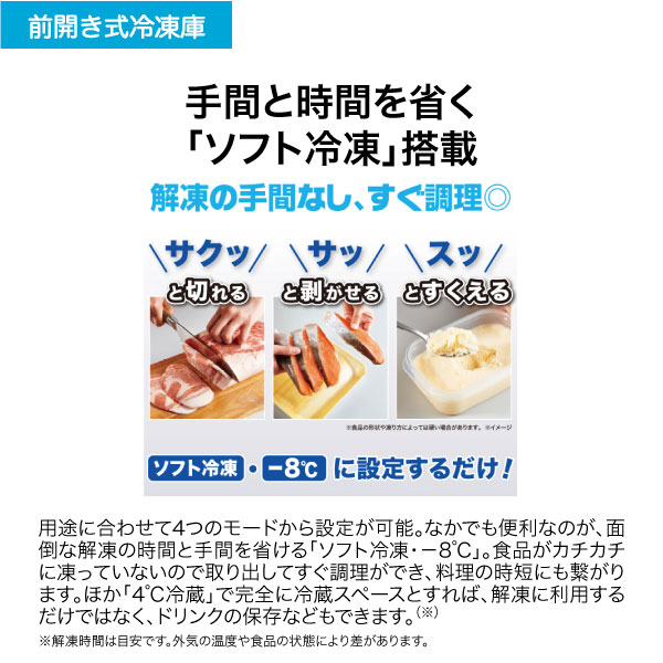 ・前面タッチ式操作パネル搭載 ・明るく見やすい庫内LED搭載 ・4℃(上下)、ー18℃冷凍(上下)、ソフト冷凍(上のみ、下設定された温度のまま)、 急冷凍(下のみ、上設定された温度のまま)の4モード ・上室4℃、8℃、ー8℃、ー16℃、ー18℃、ー20℃選択可能 ・下室ー16℃からー24℃まで1℃単位で設定可能 ・冷却方式:ファン式 ・ドア枚数:1枚 ・定格内容積:168L(上29L、下139L) ・電源電圧:単相100V(50/60Hz共通) ・定格消費電力(50/60Hz):電動機73W/83W、電熱装置128W/128W ・年間消費電力量(50/60Hz):460kWh/年 ・年間目安電気料金※1kWh=31円(税込):14,300円 ・フリーザー機能:上室スリースター、下室フォースター ・霜取り方式:自動 ・省エネ基準達成率(2021年度):116% ・多段階評価点:2.2 ・付属品:引き出し(A)4個、引き出し(B)1個 ・放熱スペース:左右20mm、後部100mm、上部100mm ・運転音25db ・電源コード長1.9m