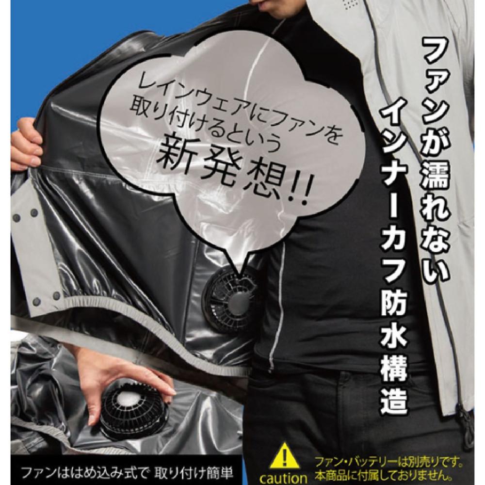 ●形状維持ワード 調節ゴム ●ハッテリーポケット付き ●腰部からの風の流出を防ぎ循環させるフロントボタン ●空調ファン対応 、内径 90mm 対応ファンサイズ ●マスクベンチレーション ●アクションカット ●ファン未使用時はEVA版を 取り外しスッキリ着用 ●シームテープ加工、防水テープ加工で水の浸水を防止 ●耐水圧(mmH2O):10,000 ●素材:表:ポリエステル100% (熱可塑性ポリウレタンラミネート) はっ水(水をはじきやすい) <空調レインウェアの活用方法> ●ウェア内部で空気が循環するので、汗が乾きやすく、服の中の不快感を軽減させる効果があります。 ●体感温度が下がり、 熱中症リスクを軽減させます。 ※低体温症を招く恐れがあるため、適度に風力を 調整し、体調管理をおこなってください。 ●吸水速乾素材のウェアと組み合わせることでより 効果を発揮します。