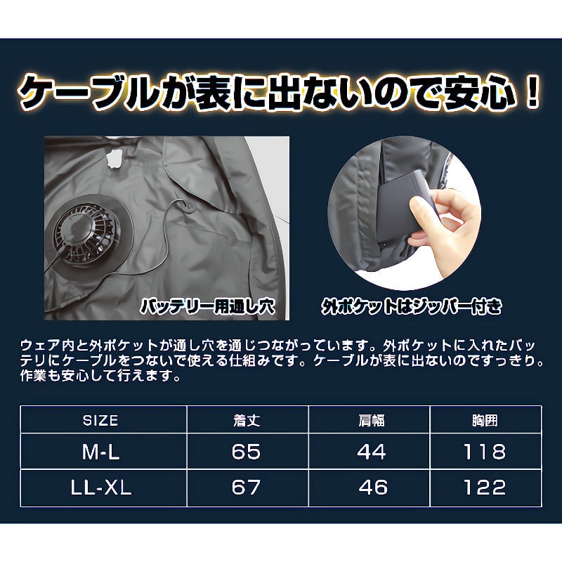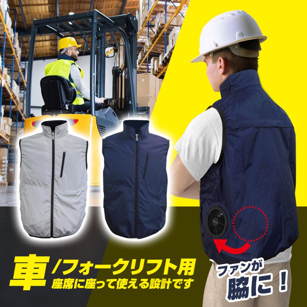 車やフォークリフトを運転しながら使えるよう、ファンの位置を脇に持ってきました。倉庫でのフォークリフト作業がこれで楽に!また、高密度ポリエステル生地なのでより風を感じます。