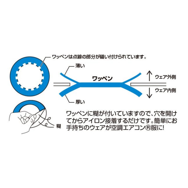 ワッペンに糊が付いていますので、穴をあけてからアイロン接着するだけです。簡単にお手持ちのウェアが空調エアコン(R)服に。