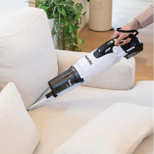 "●ブラシレスモータ搭載 ●吸込仕事率:パワフル100W・強60W・標準35W・エコ15W ●集じん容量250ml ●連続使用時間:パワフル約8分・強約15分・標準約21分・エコ約38分 ●充電時間:実用充電約17分・フル充電約22分 ●標準付属品:本体・バッテリBL1830B×1個・充電器DC18RF・ノズル・ストレートパイプ・サッシノズル"