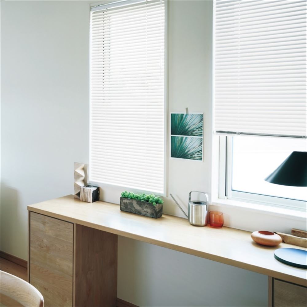 ブラインドの操作棒やコードがシンプルにまとまっているワンポールタイプだから、見た目がスッキリ。はねを回転させるだけで外からの光をお部屋の中に取り入れます。