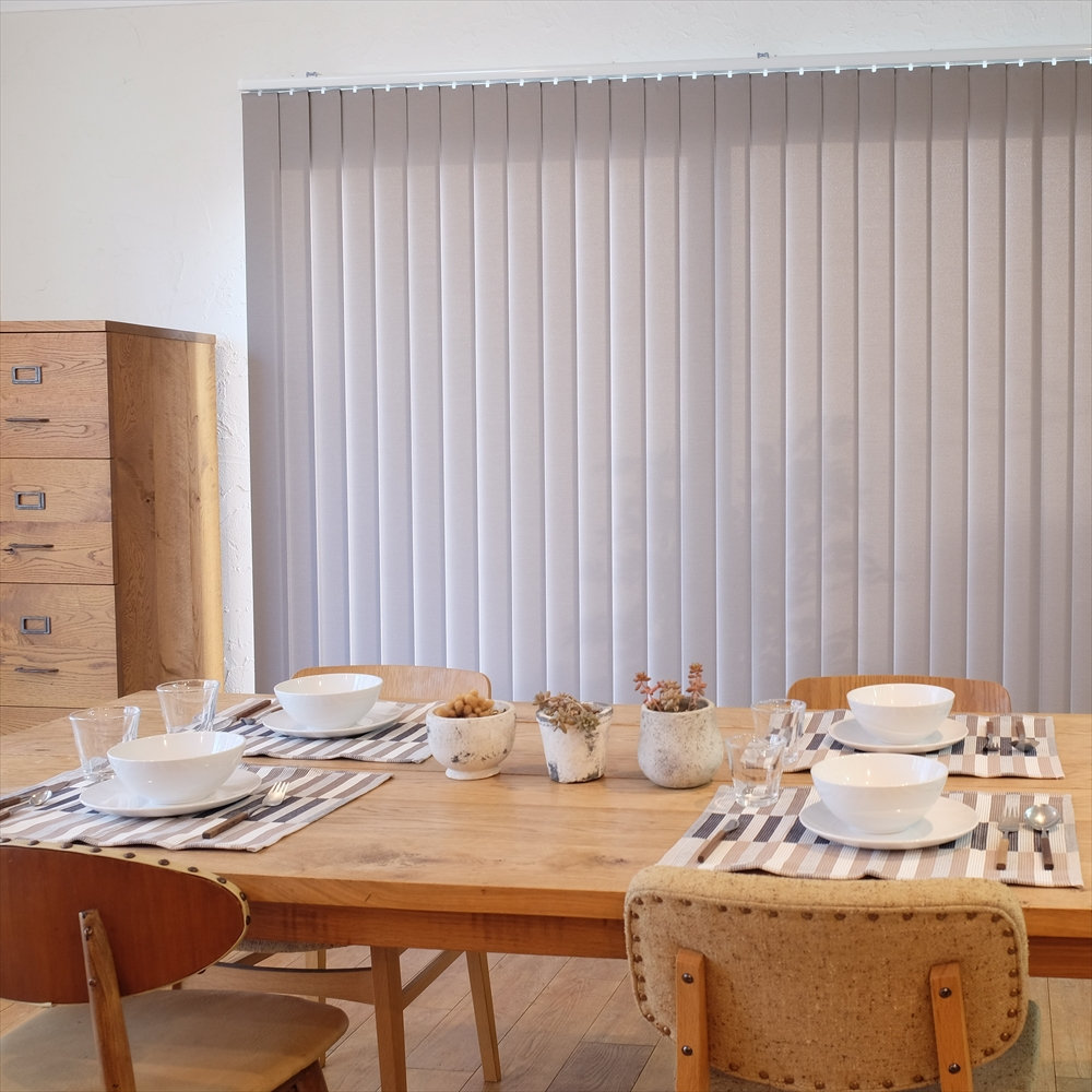 帯状の布製のスラット(ルーバー)を縦に吊るしたバーチカルブラインドは、そのスッキリとした見た目から空間をモダンに演出してくれるアイテムです。カーテンを吊ると見た目が重くなりがちな高さのある大きな窓に取付けると、シンプルでスッキリとした見栄えになります。