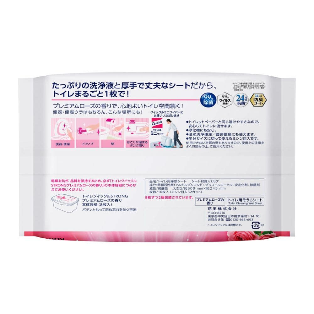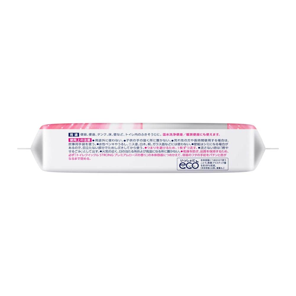 使用上の注意:使用上の注意 ●用途外に使わない。 ●子供の手の届く所に置かない。 ●荒れ性の方や長時間使用する場合は、炊事用手袋を使う。 ●水性ペンキやうるし、ニス塗、白木、桐、ガラス面などには使わない。 ●壁紙はシミになる場合があるので、目立たない部分でためしぶきしてから使う。 ●つまりを避けるため、1枚ずつ流す。 ●流さない時は「燃やせるごみ」として出す。 ●火気の近く、日の当たる所および高温になる所に置かない。 ●乾燥を防ぎ、品質を保持するため、必ず「トイレクイックルSTRONGプレミアムローズの香り」の本体容器につめかえて、容器のフタの手前をパチンと音がなるまで閉める。
