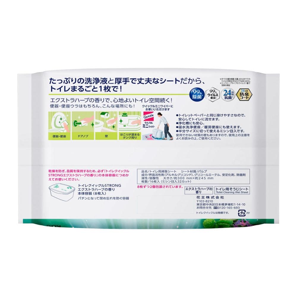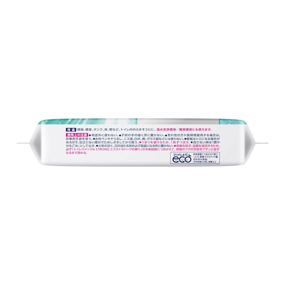 使用上の注意:使用上の注意 ●用途外に使わない。 ●子供の手の届く所に置かない。 ●荒れ性の方や長時間使用する場合は、炊事用手袋を使う。 ●水性ペンキやうるし、ニス塗、白木、桐、ガラス面などには使わない。 ●壁紙はシミになる場合があるので、目立たない部分でためしぶきしてから使う。 ●つまりを避けるため、1枚ずつ流す。 ●流さない時は「燃やせるごみ」として出す。 ●火気の近く、日の当たる所および高温になる所に置かない。 ●乾燥を防ぎ、品質を保持するため、必ず「トイレクイックルSTRONGエクストラハーブの香り」の本体容器につめかえて、容器のフタの手前をパチンと音がなるまで閉める。