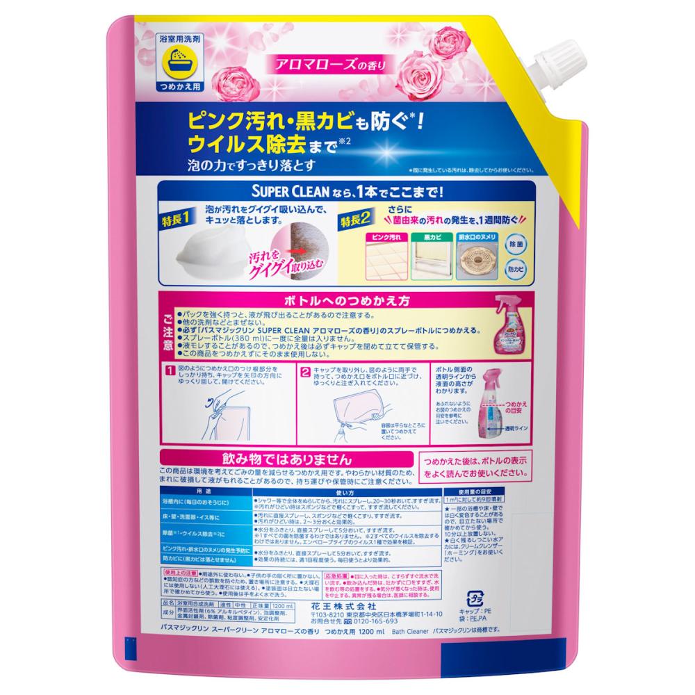 使用上の注意:<ボトルへのつめかえ方> ●パックを強く持つと、液が飛び出ることがあるので注意する。 ●他の洗剤などとまぜない。 ●必ず「バスマジックリン SUPER CLEAN アロマローズの香り」のスプレーボトルにつめかえる。 ●スプレーボトル(380 ml)に一度に全量は入りません。 ●液モレすることがあるので、つめかえ後は必ずキャップを閉めて立てて保管する。 ●この商品をつめかえずにそのまま使用しない。 <使用上の注意> ●用途外に使わない。 ●子供の手の届く所に置かない。 ●認知症の方などの誤飲を防ぐため、置き場所に注意する。 ●大理石には使用しない(人工大理石には使える)。 ●塗装面は目立たない場所で確かめてから使う。 ●使用後は手をよく水で洗う。 <応急処置> ●目に入った時は、こすらずすぐ流水で洗い流す。 ●飲み込んだ時は、吐かずに口をすすぎ、水を飲む等の処置をする。 ●気分が悪くなった時は、使用を中止する。異常が残る場合は、医師に相談する。