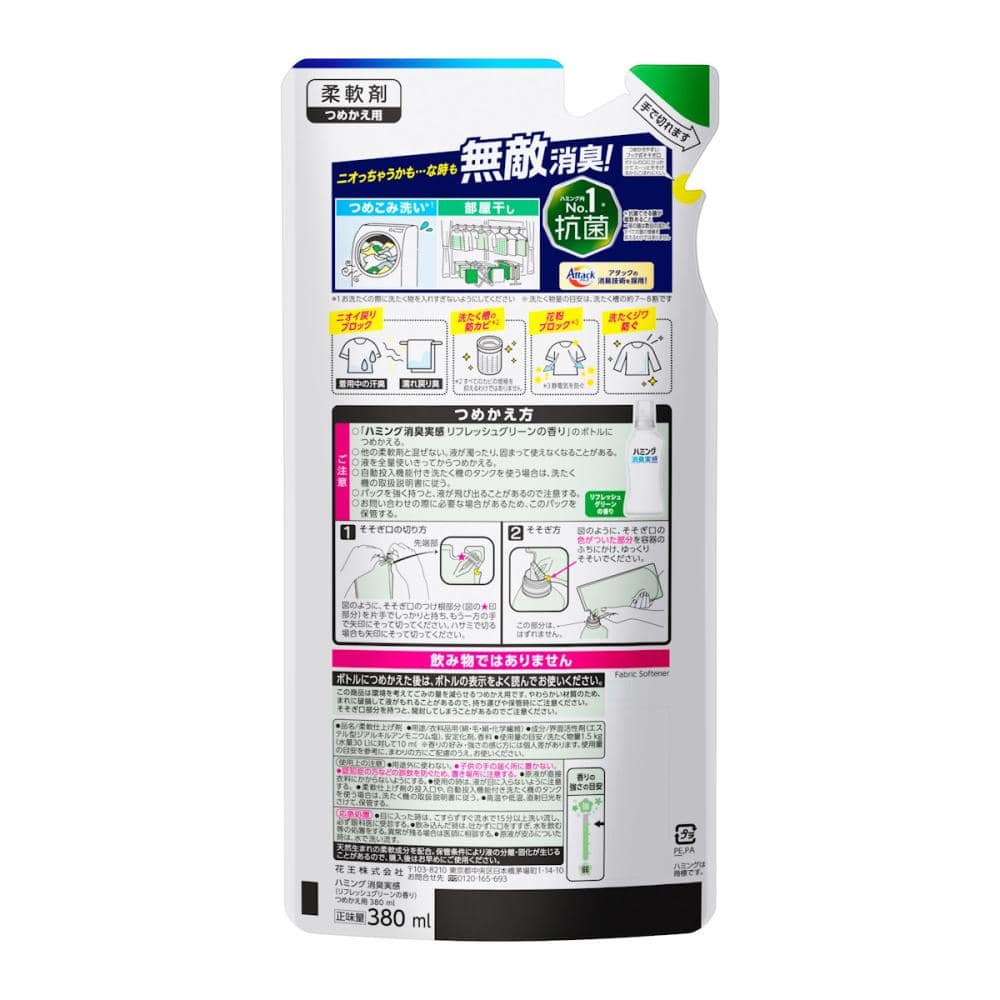 使用上の注意:つめかえ方 ご注意 ○必ず「ハミング消臭実感 リフレッシュグリーンの香り」のボトルにつめかえる。 ○他の柔軟剤と混ぜない。液が濁ったり、固まって使えなくなることがある。 ○液を全量使いきってからつめかえる。 ○自動投入機能付き洗たく機のタンクを使う場合は、洗たく機の取扱説明書に従う。 ○パックを強く持つと、液が飛び出ることがあるので注意する。 ○お問い合わせの際に必要な場合があるため、このパックを保管する。 使用上の注意 ●用途外に使わない。 ●子供の手の届く所に置かない。 ●認知症の方などの誤飲を防ぐため、置き場所に注意する。 ●原液が直接衣料にかからないようにする。 ●使用の時は、液が目に入らないように注意する。 ●柔軟仕上げ剤の投入口や、自動投入機能付き洗たく機のタンクを使う場合は、洗たく機の取扱説明書に従う。 ●高温や低温、直射日光をさけて、保管する。