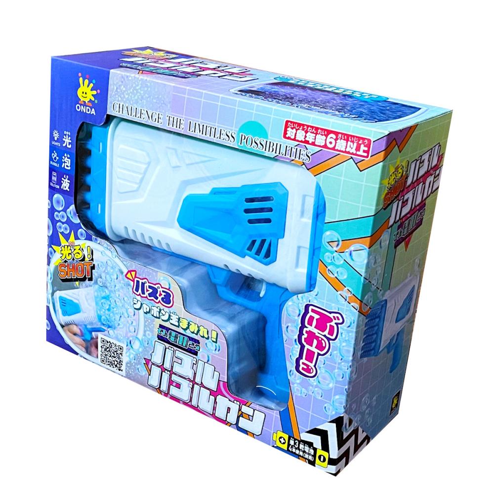 別買いの単三電池4本を装着し、発射口に附属のしゃぼん玉液を漬けトリガ-を引きと、発射口が光りシャボン玉が一気に大量発射します。