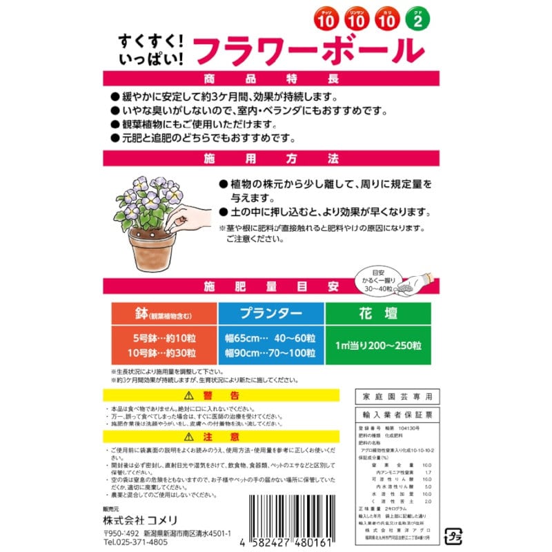 ●土の中に押し込むと、より効果が早くなります。※茎や根に肥料が直接触れると肥料やけの原因になります。ご注意ください。