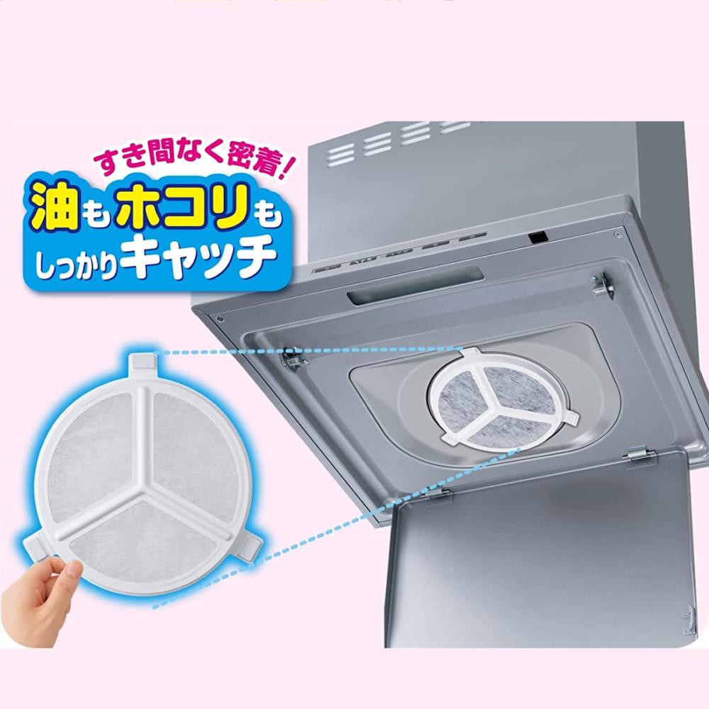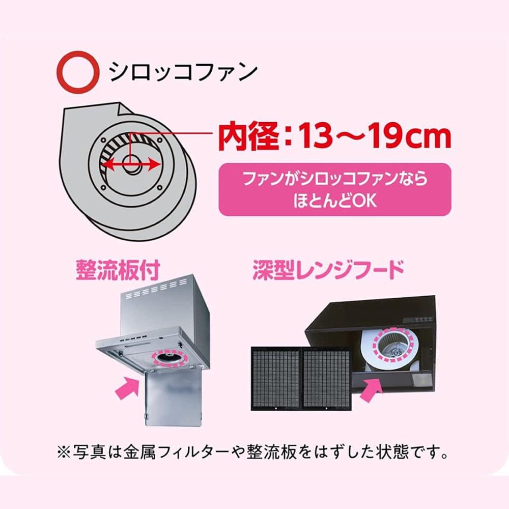 お掃除しにくいレンジフードの奥を予防掃除 フィルターとフレームが一体型なので、ピッタリカバー 組立いらずで、ワンタッチで簡単に取付可能 シロッコファンの油やホコリ汚れを防ぐ 内径13~19cmの様々なシロッコファンに適合します