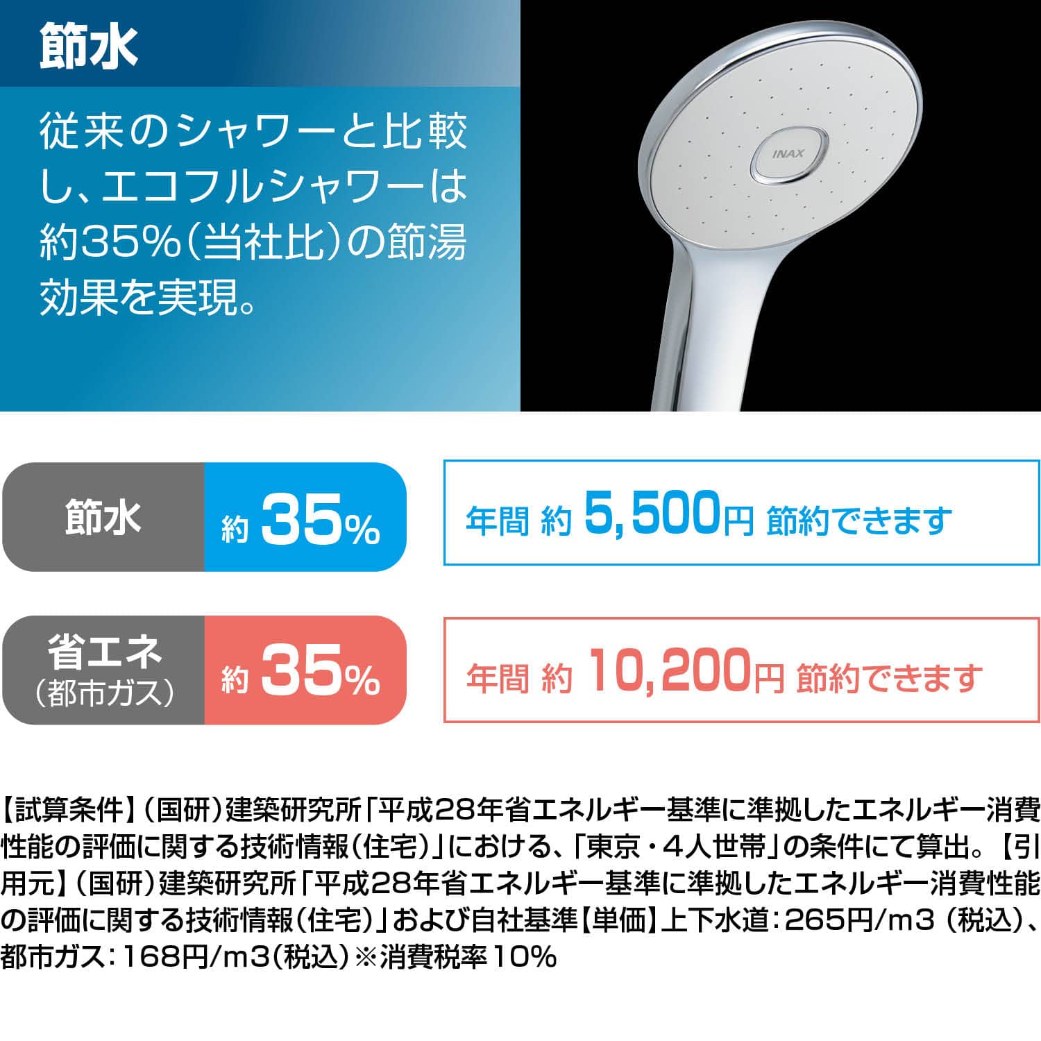 ●エコアクアシャワー:大判のシャワーヘッドと空気を含んだ大粒の水滴で浴び心地のよさを向上、さらに節湯性能も両立させました。