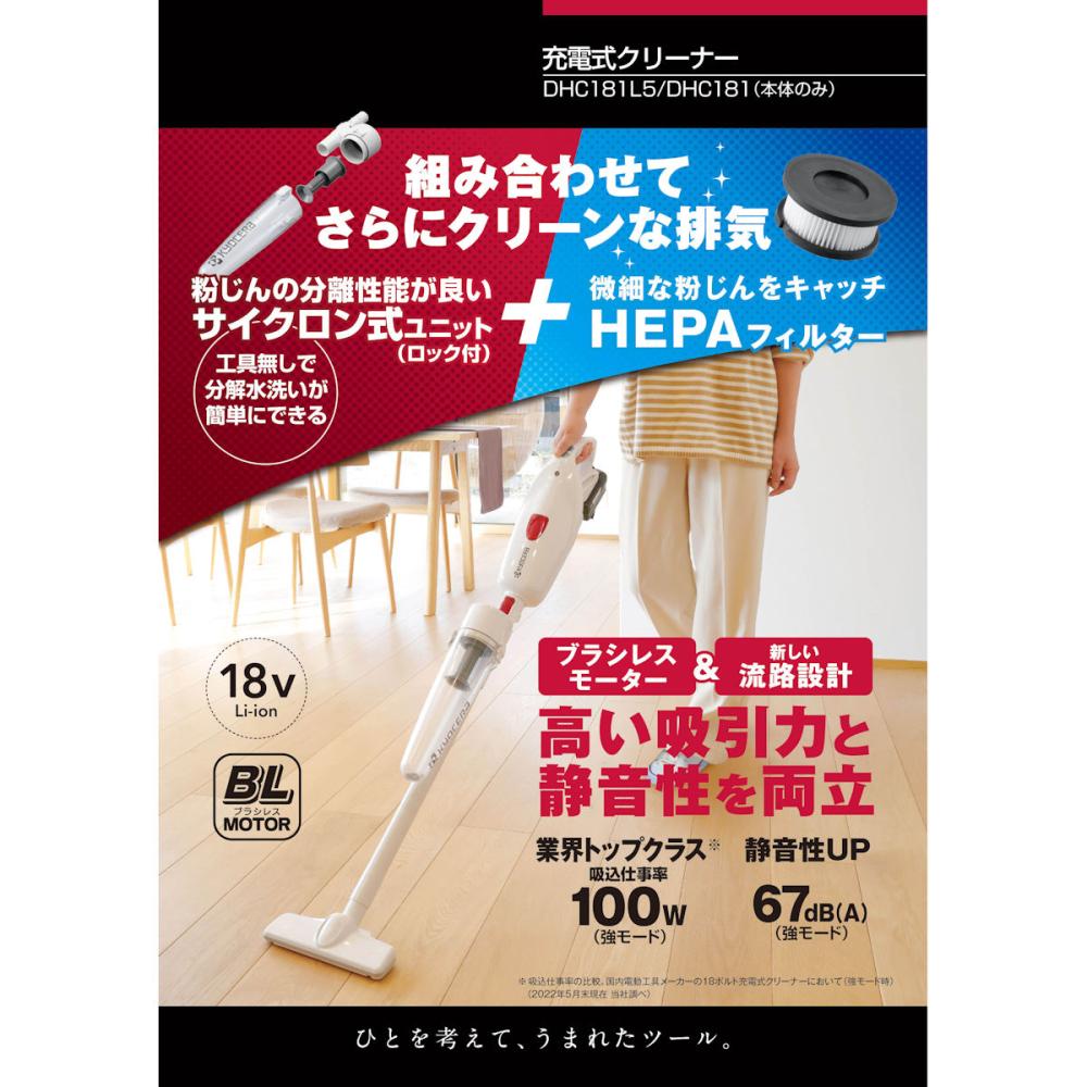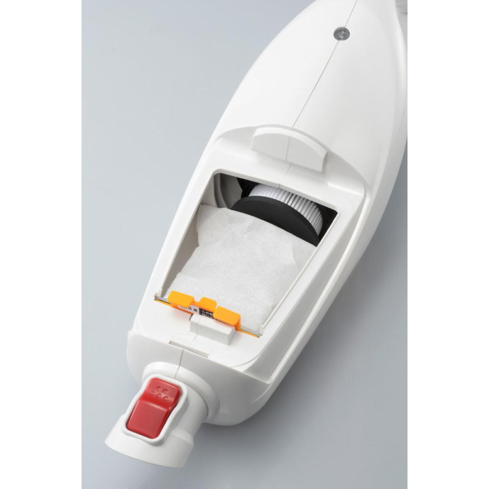 "●アレルゲン(花粉・ハウスダスト・ダニの死骸など)を含む小さな塵埃も補修可能なHEPAフィルター標準付属 ●サイクロン式ユニット採用 ●吸込仕事率と運転時間 強モード:100 W20分 中モード:50W 35分 弱モード:35W 45分 ●充電時間84分"
