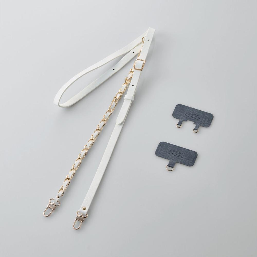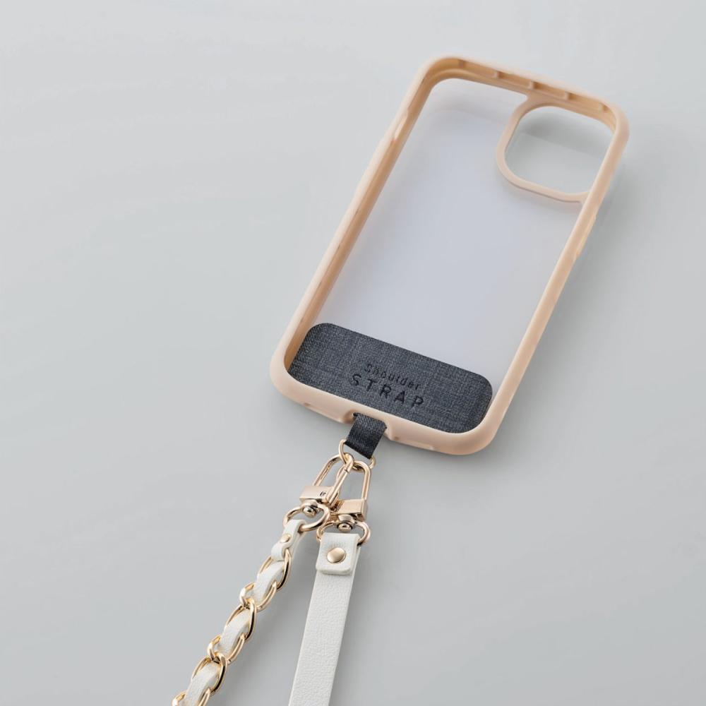 ・ケースにストラップホールがなくても、付属のストラップシートをスマートフォンとケースの間に挟むだけで使用でき、取り外しも簡単です。