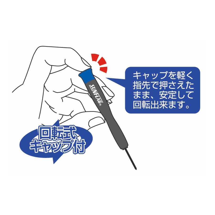 キャップを軽く指先で押さえたまま、安定して回転出来ます。 ●Y型 2.2mm ドライバー ●Y型1.8mm ドライバー ●Y型0.8mm ドライバー ●星型1.4mm ドライバー ●プラスNo.00ドライバー ●プラスNo.0ドライバー