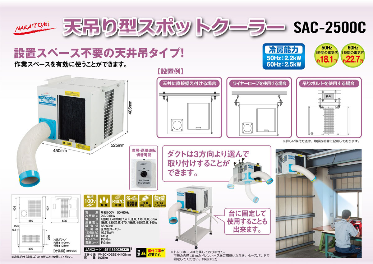 ●電源 単相100V 50/60Hz ●定格電流 50Hz送風 1.4A 冷風 8.0A 60Hz送風 1.9A 冷風 9.3A ●消費電力 50Hz送風 130W 冷風730W 60Hz送風 190W 冷風930W ●冷房能力 50Hz 2.2kW 60Hz 2.5kW ●冷媒 HFC R407C 封入量(550g) ●コンプレッサー 全閉型ロータリー(0.75kW) ●スイッチ ロータリー式(切・送風・冷風) ●騒音値 66/69dB ●電源コード 約3.5m ●スイッチコード 約3.8m