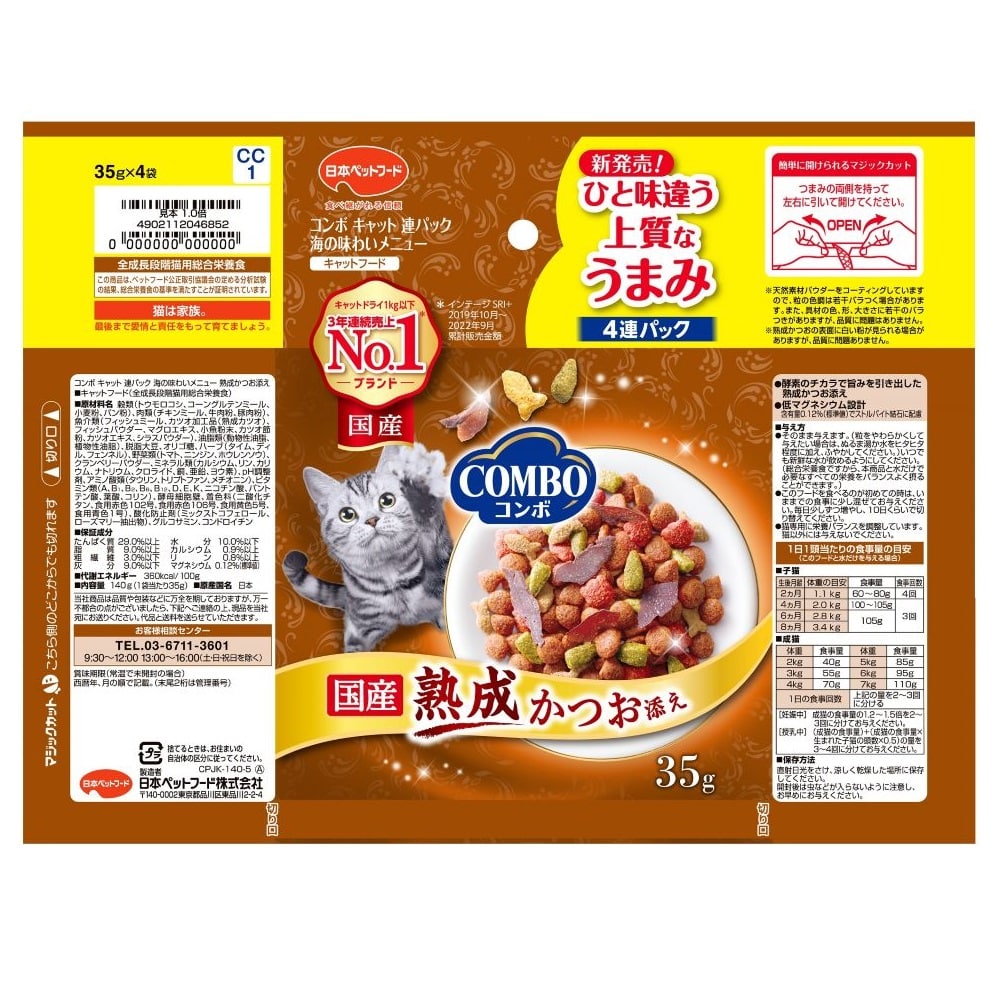 原材料・成分:穀類(トウモロコシ、コーングルテンミール、小麦粉、パン粉)、肉類(チキンミール、牛肉粉、豚肉粉)、魚介類(フィッシュミール、カツオ加工品(熟成カツオ)、フィッシュパウダー、マグロエキス、小魚粉末、カツオ節粉、カツオエキス、シラスパウダー)、油脂類(動物性油脂、植物性油脂)、脱脂大豆、オリゴ糖、ハーブ(タイム、ディル、フェンネル)、野菜類(トマト、ニンジン、ホウレンソウ)、クランベリーパウダー、ミネラル類(カルシウム、リン、カリウム、ナトリウム、クロライド、銅、亜鉛、ヨウ素)、pH調整剤、アミノ酸類(タウリン、トリプトファン、メチオニン)、ビタミン類(A、B1、B2、B6、B12、D、E、K、ニコチン酸、パントテン酸、葉酸、コリン)、酵母細胞壁、着色料(二酸化チタン、食用赤色102号、食用赤色106号、食用黄色5号、食用青色1号)、酸化防止剤(ミックストコフェロール、ローズマリー抽出物)、グルコサミン、コンドロイチン