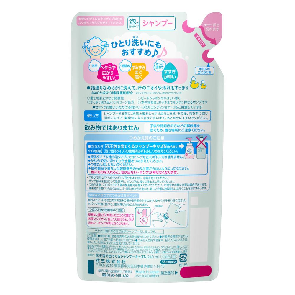 使用上の注意:つめかえ時のご注意 ●かならず「花王泡で出てくるシャンプーキッズN(からまりやすい髪用)」(泡で出るタイプ)の使用済みボトルにつめかえてください。 ●液体タイプや他の泡タイプ(ハンドソープなど)のボトルでは使えません。 ●かならず使い切ってから全量をつめかえてください。 ●つぎたしは、しないでください。 ●他の製品や異なった製造番号のものが混ざらないようにしてください。 他のものを入れると、泡が出ない・ポンプが押せなくなります。 ・つめかえ前にボトルの中とポンプ部分をよく洗い、水気を切ってください。ポンプ部分は逆さにして数回押し、ポンプ内に残った液も出し切ってください。 ・つめかえ後、このパックの下部の製造番号を控えておいてください。お問合せの際に必要な場合があります。 ・衛生的にお使いいただくために、2~3回つめかえた後には、新しい容器にお取替えいただくことをおすすめします。 つめかえ後の使用時のご注意 容器は、傾けず、安定したところに置いてお使いください。振ったり傾けると、泡が出ない・ポンプが押せなくなります。 ご注意 ●頭皮に傷、湿疹等異常のある時は使わないでください ●刺激等の異常が出たら使用