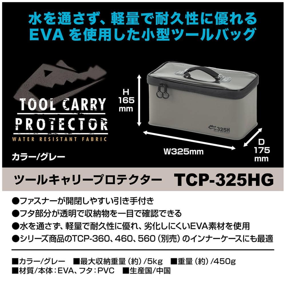 水を通しにくいEVA素材を使用し、止水ファスナーで水の侵入に強いツールバッグです。