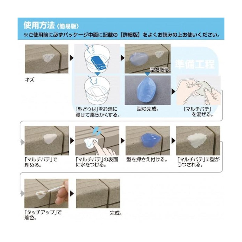 ●石材・タイル・サイディング・ブロック・レンガ・金属・木部にも使えます! 「型どり材」 ●お湯(80℃以上の沸騰したお湯が最適です)に浸すと柔らかくなり、リアルな型が取れる樹脂です。 ●一度冷えて固まっても、再びお湯に浸けると何度でも新しい型を取ることができます。 ●お湯に浸けて型が取れる柔らかさになると、青色→半透明になります。 ※半透明になれば柔らかくなったサインです。 ●お湯から出して押し付けて固まると、半透明→青色に変色します。 ※青色になれば型が取れたサインです。 ●型どり材の色で【柔らかくなった】ことや 【型が取れた】ことが確認できます。 「マルチパテ」 ●練り合わせるだけで簡単に使用できます。 ●作業がしやすい10分硬化(接着・成形可能時間) ●石材、タイル、サイディング、コンクリート、ブロック、レンガ、磁器、木材、木製品、金属、硬質プラスチックなど、 ほとんどの硬質材に使用できます。 ●熱、水にも強く、屋内外で使用できます。 ●完全硬化後(24時間後) 塗装もできます。(水性・油性OK) ※ポリエチレ ン、ポリプロピレン、シリコーン樹脂、 フッ素樹脂、ナイロン、軟質ビニール、ゴムなどには使用できません。 ※浴槽内や、飼育水槽などの補修には使用できません。 ※高価格品、貴金属、食器には使用しないでください。 「タッチアップ」 ●絵の具感覚で簡単に塗ることができます。 ●隠蔽力が強い顔料タイプで、乾くと美しいツヤ消し状に仕上がります。 ●乾燥時間も早く、乾くと耐水性になります。(表面乾燥:5〜45分、完全乾燥: 12時間以上) ●「かくれん棒・タッチアップ」 どうしで混ぜ合わせて調色することができます。 ●ツヤを合わせたい場合は、市販のニスなどをご利用ください。