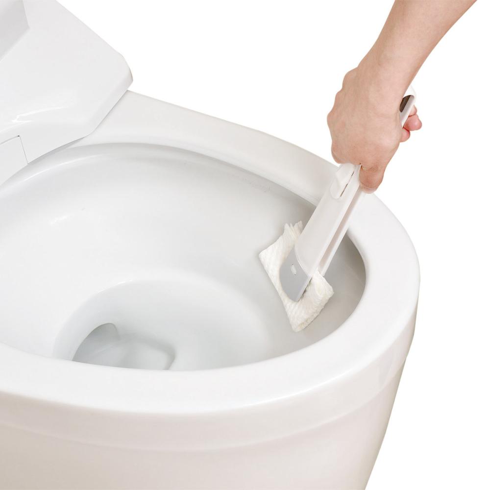 ●トイレットペーパーやお手持ちの流せるトイレシートで、いつでもささっと手軽におそうじができます。 ●はさんで固定して使うので、手を汚さず衛生的です。 ●お掃除後使ったシートやペーパーをさわらずにトイレにサッと流せます。 ●気になった汚れを見つけたら、サッと「はさんで」「洗って」「流す」だけ! ●先端がギザギザ形状なのでシートをしっかり挟めます。 ●先端は便器にキズが付かないクッション構造です。 ●挟んだシートを固定できるロック付きなので、挟んだシートやトイレットペーパーが落ちません。 ●場所をとらずに立てて収納できるスタンド付き。 ●キズの心配がいらないので防汚加工のトイレに最適です。