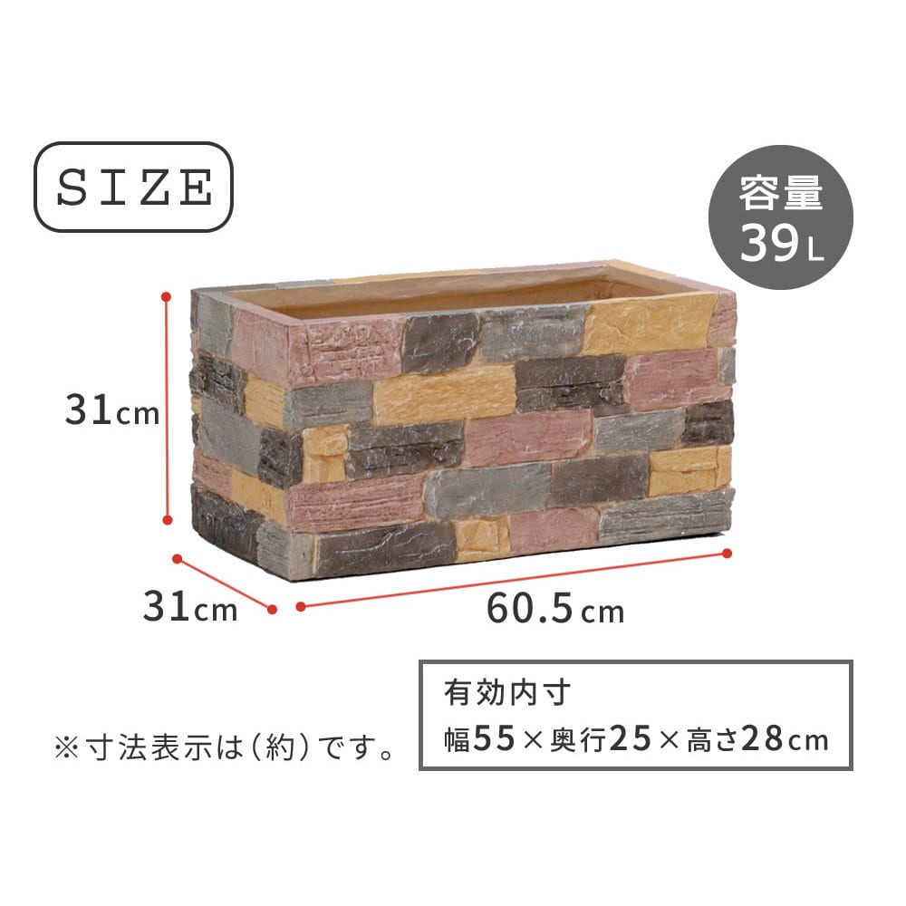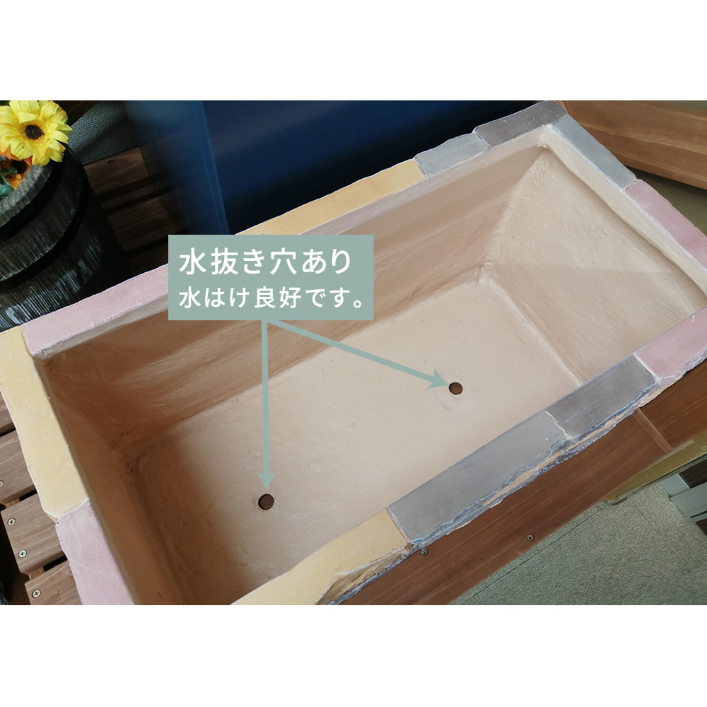 レンガの花壇って素敵♪でも、一から作るのは一苦労…。 リアルな凹凸がおしゃれなレンガ調プランターなら、簡単にレンガ造りの雰囲気を味わえます。 なかなか実店舗にない商品なので、ガーデニングをおしゃれに楽しみたい ご近所さんの間で話題になりそう。 お庭はもちろん、ウッドデッキやマンションのベランダのような、 土のない場所でも楽しめます。 ・本物のレンガで花壇を作るより簡単、お安い。 ・プラスチック製に比べて高級感がある。 ・陶器の鉢より衝撃に強く、耐久性に優れ、お手入れ簡単。 ・鉢カバーとしても使える。 ・土のない場所でも設置できる。 ・レンガ調はどんな植物、外壁とも好相性。 レンガの個性的な風合いを再現するため、「TERRE(テール)」シリーズは ハンドメイドで作られています。そのため、プランターの形やカラー、 表面の加工等は、ひとつひとつに個体差があります。 画像のような違いがあることをご理解いただき、ハンドメイド商品特有の温かみを楽しんでいた だけたらと思います。