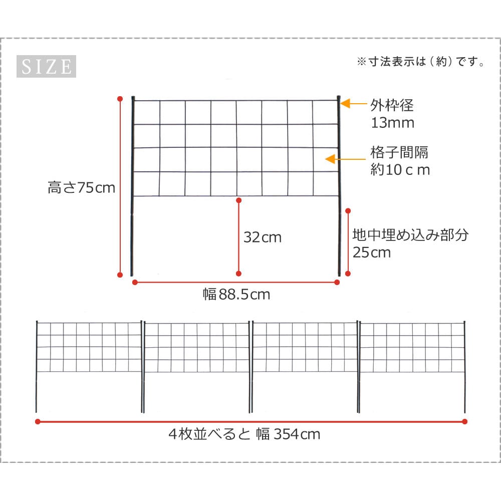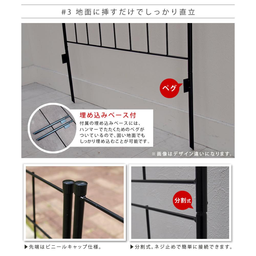 洗練されたスタイリッシュさも、クラシカルで優美な雰囲気も感じられます。シンプルモダン、イングリッシュガーデン、フレンチ、ナチュラルetc...、どんなテイストの空間も引き立てて、場所を問わず活躍します。見通しのいいアイアンフェンスは、お庭の開放感を維持できるうえに、木製のものより経年劣化が少ないのがポイント。視界がひらける高さ約75cmのロータイプは、お庭をすっきり広く見せる効果大。花壇や家庭菜園作りにも役立ちますよ。