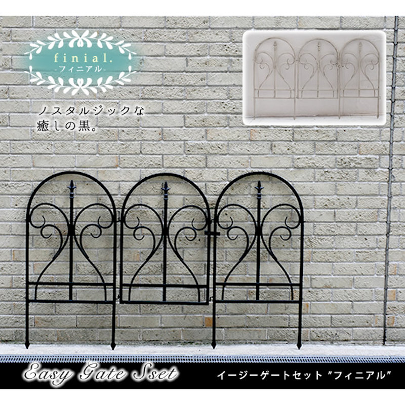 丸みのあるデザインが、高貴な愛らしさを感じさせる開閉式のゲートセットです。ゲートとしてだけでなく、同じフィニアルシリーズで複数枚つなげれば正方形・長方形の花壇を作ることもできます。一から門を作るとなると、時間も費用もかかりますが、これなら地面に差し込むだけで簡単に、門扉つきのおしゃれなゲートが完成します。つるの絡みやすいデザインなので、バラや朝顔のトレリスにもいいですね。連結はネジなどは使わず、上から差し込むだけのカンタン仕様。使わない時は連結を外せば、コンパクトに収納できます。