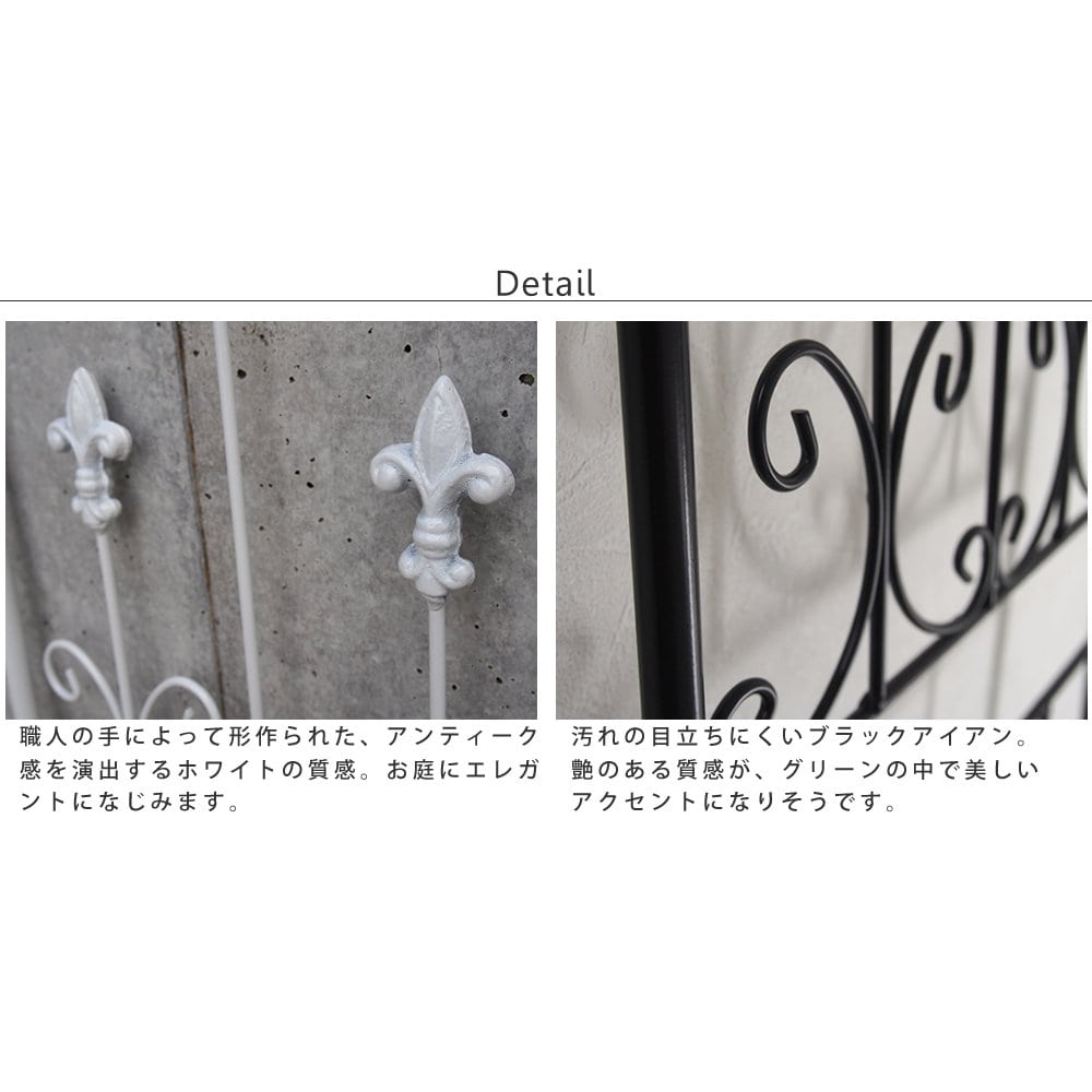 プロのガーデナーが手がけたようなお庭に。深い森の中に建つ石造りの古城…そんな雰囲気を漂わせる、繊細で風雅なデザインのアイアンフェンスです。ちょっとさびしい玄関付近や、外壁沿いの味気ない花壇などに、華やかで高級感のあるフェンスをプラスすれば、立体感・躍動感が生まれます。エッジングに絶妙のサイズ感。高さ47.5×幅39cmのスティックタイプは、花壇や立ち入ってほしくないエリアのエッジングに最適です。複数枚をお好きな角度で連結できるので、正方形・長方形の花壇はもちろん、少しずつ角度をつけて円形の花壇を作ることも可能です。設置は簡単、連結して地面に刺すだけ。工事や見積もりといった面倒な手間をかけずに、まるで造り付けのようなフェンスが設置できます。