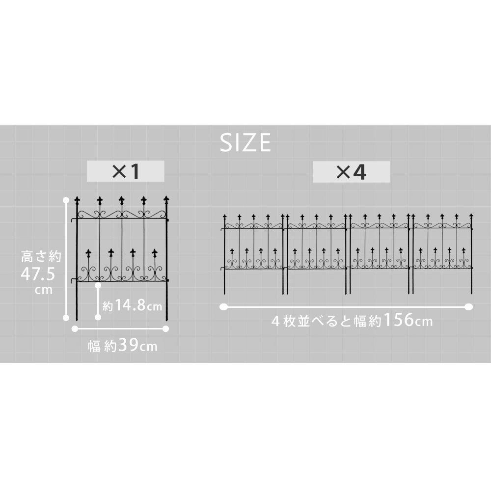 プロのガーデナーが手がけたようなお庭に。深い森の中に建つ石造りの古城…そんな雰囲気を漂わせる、繊細で風雅なデザインのアイアンフェンスです。ちょっとさびしい玄関付近や、外壁沿いの味気ない花壇などに、華やかで高級感のあるフェンスをプラスすれば、立体感・躍動感が生まれます。エッジングに絶妙のサイズ感。高さ47.5×幅39cmのスティックタイプは、花壇や立ち入ってほしくないエリアのエッジングに最適です。複数枚をお好きな角度で連結できるので、正方形・長方形の花壇はもちろん、少しずつ角度をつけて円形の花壇を作ることも可能です。設置は簡単、連結して地面に刺すだけ。工事や見積もりといった面倒な手間をかけずに、まるで造り付けのようなフェンスが設置できます。