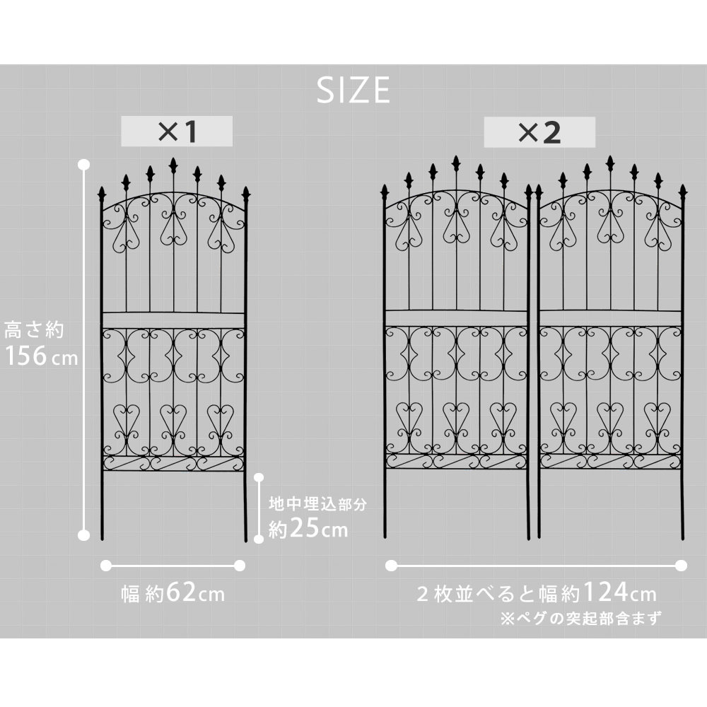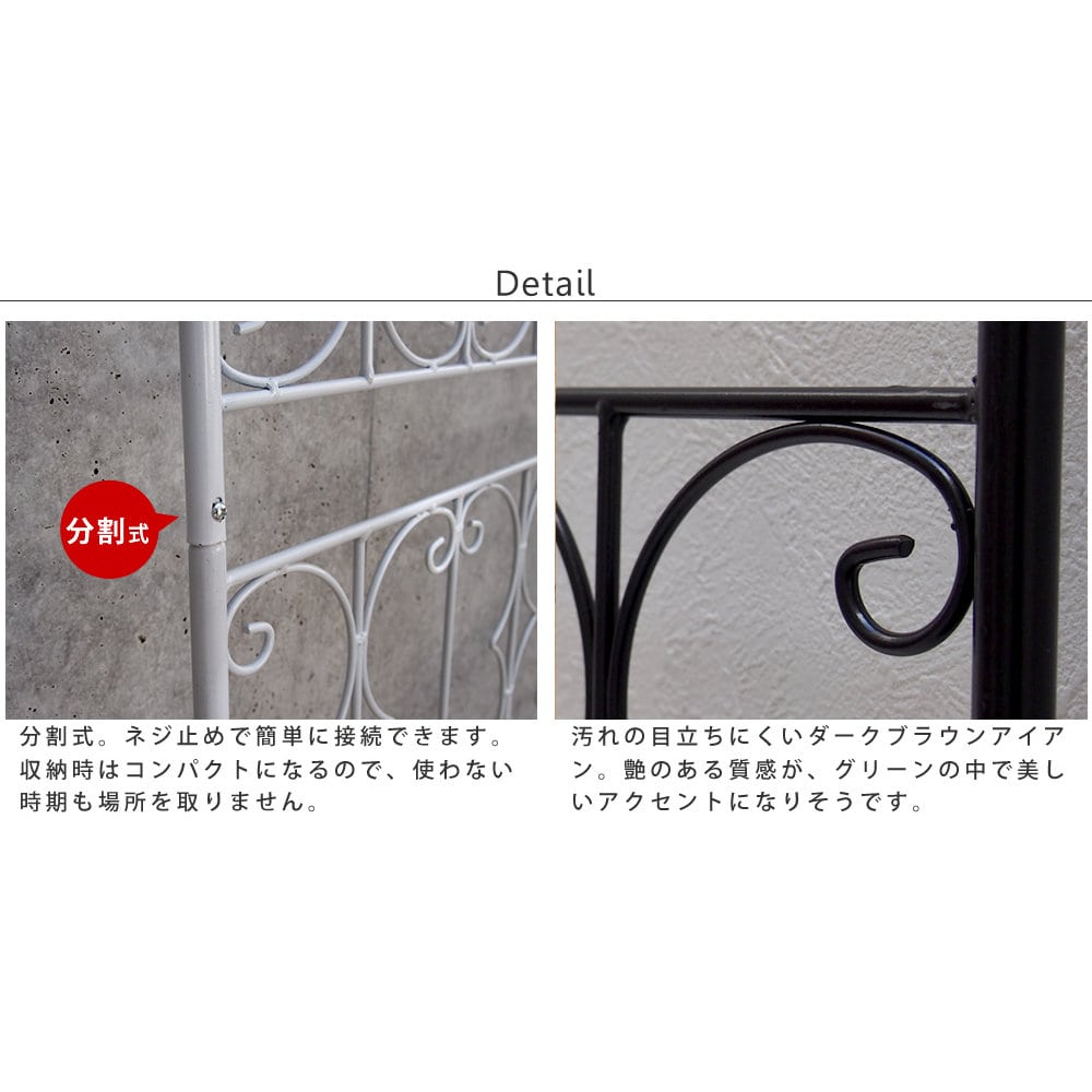薔薇をからませるのにピッタリ!エレガントな雰囲気のアイアンフェンスです。硬質な印象のアイアンの中ではめずらしく、やわらかなブラウンカラーの塗装と、薔薇のツタ&薔薇のつぼみのデザインが施され、上品で華やかなイメージ。壁に立てかけるだけで瀟洒(しょうしゃ)な存在感があり、蔦をからませればまるでロマンチックな古城の庭!オフシーズンでもお庭を華やかにしてくれます。薔薇とはもちろんベストマッチで、美しさをより引き立てます。ゴーヤやキュウリでグリーンカーテンにしても◎。高さ150cmのロータイプは、隣家との境界線に使うと、視線を遮りすぎることなく毎朝のご挨拶もできます。やんわりと目隠ししながらも、風通しが良く、軽やかでオシャレ。 見るたびに幸せな気持ちになれるフェンスです。