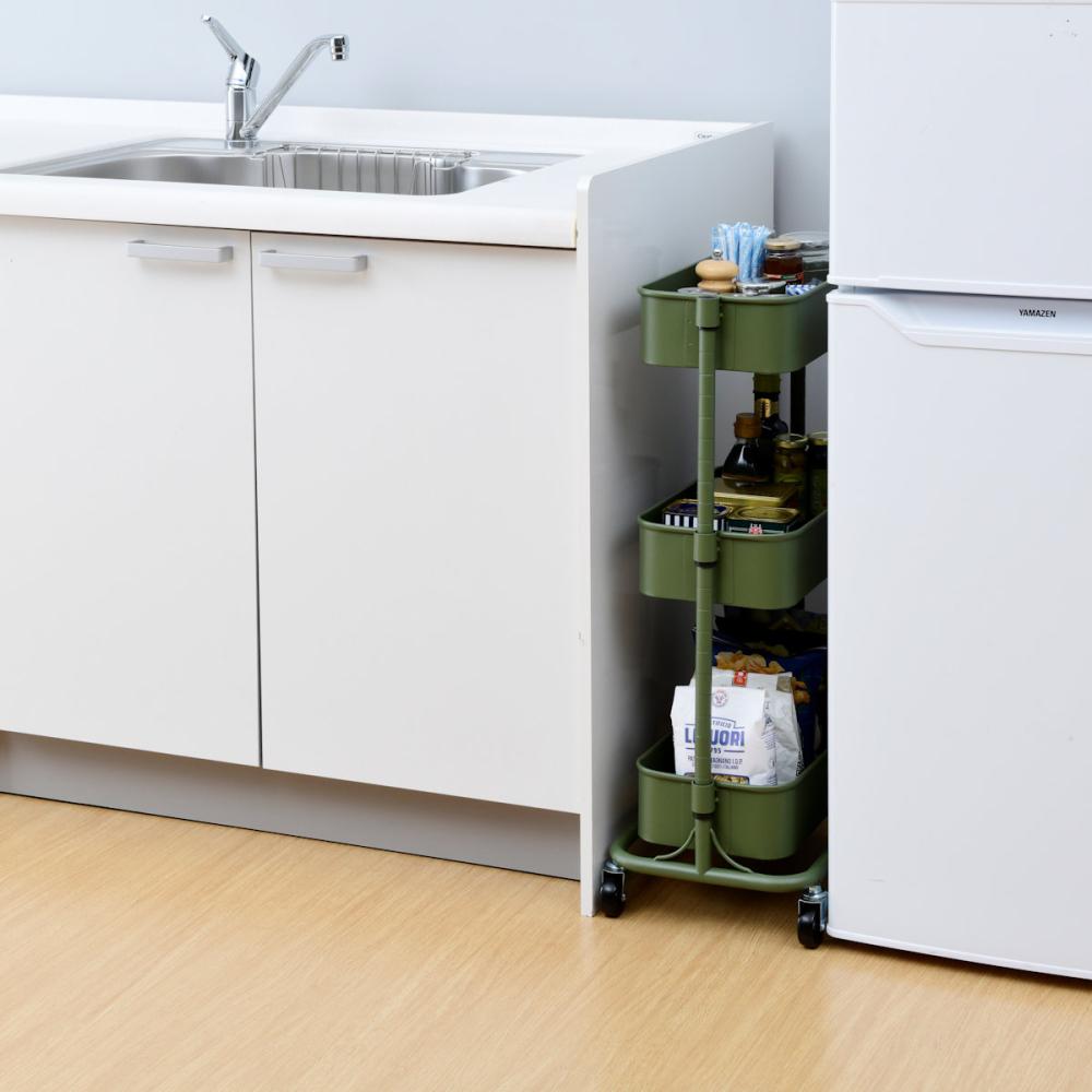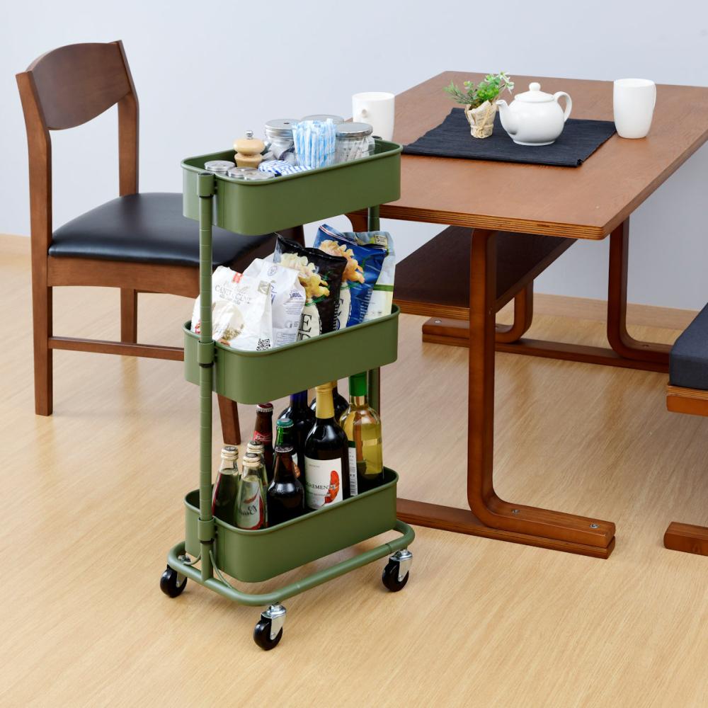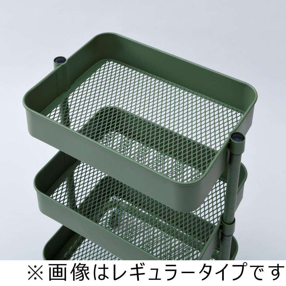 ■上から放り込める、バスケットタイプのキャスター付きワゴン ■バスケットの底は、野菜やタオルの収納にも合う、通気性の良いメッシュタイプ。 ■3つのバスケットはモノに合わせて、2.5cm間隔、23段階で高さを選んで設置可能 ■重量キャスターで、重いモノが載ってもスイスイ移動