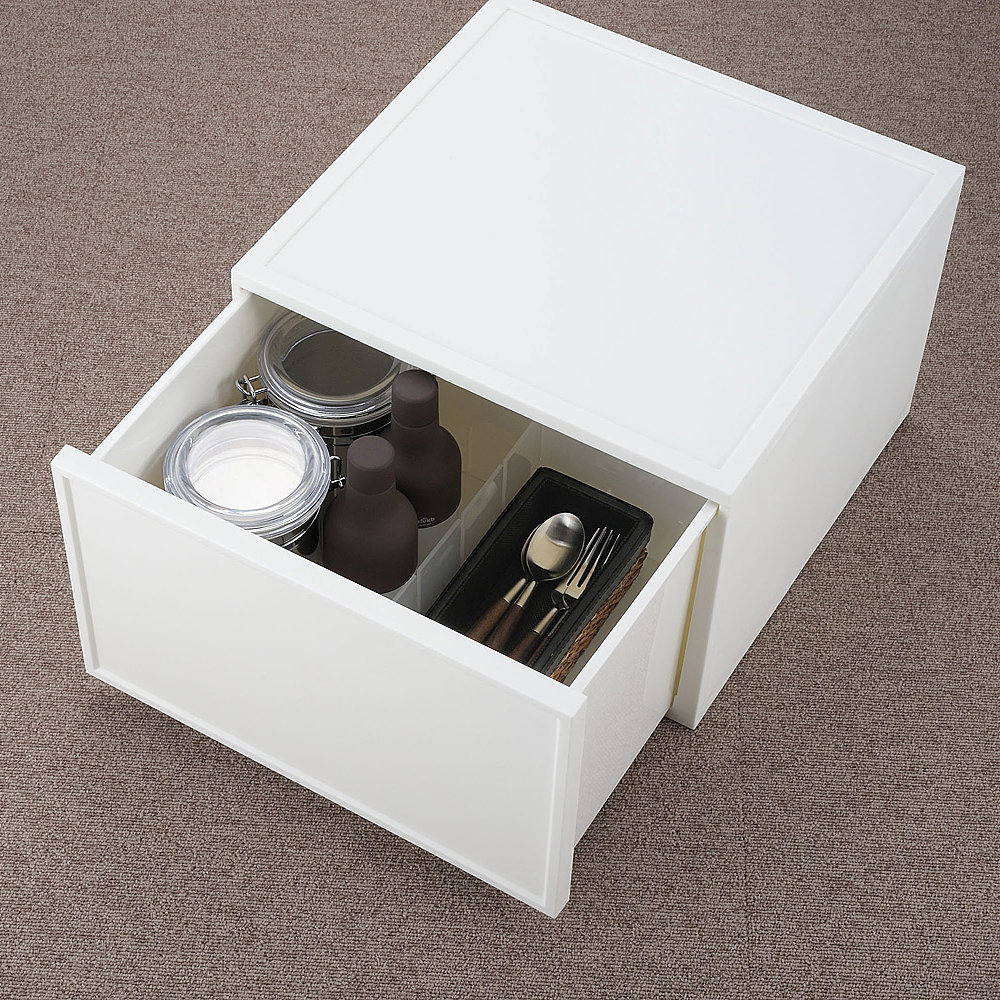 【サイズ】 外寸:約幅36×高さ24.3×奥行36cm 引き出し内寸:約幅30.5×高さ20.6×奥行30.5cm 【収納目安】 CD2列に40枚程度 【付属品】 仕切り板付き 【耐荷重】 8kg 【材質】 本体:ポリプロピレン、ステンレス鋼 すべり止め:エラストマー樹脂 【原産国】 日本