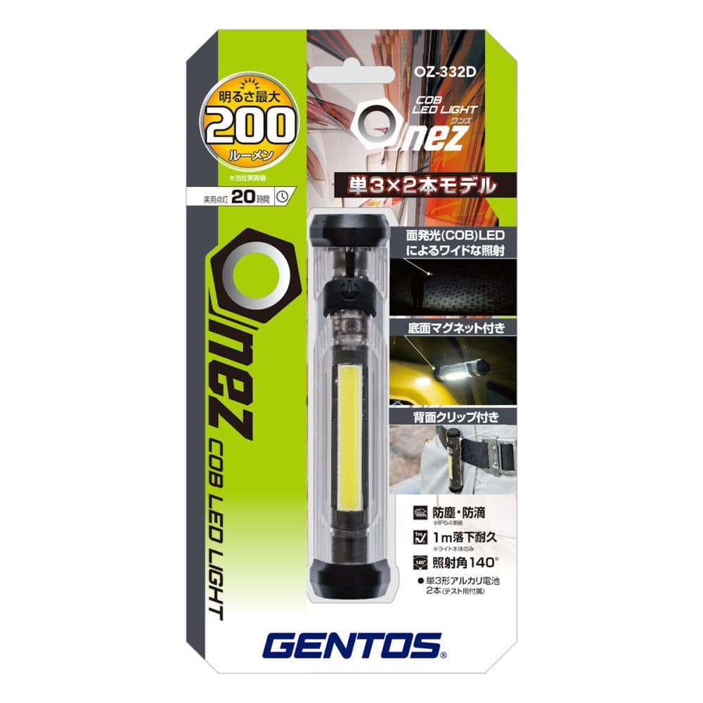 ・COB LED:多数のLEDチップを密集して基盤に直接実装した光源。多灯式に比べ多重影ができにくく、照射範囲も広い特長を持つ。 ・底面マグネット ・背面クリップ:作業ベルト等に挟んで使用可能。 ・フロントプッシュスイッチ <仕様> 使用光源:高輝度白色COB LED×1個 明るさ(約):200ルーメン(最大時) 輝度(約):83カンデラ 使用電池:単3形アルカリ電池×2本 エネループ・充電式エボルタ使用可能 点灯時間(約):20時間 照射特性:照射角度 140° 照射距離(約):18m(最大時) 保護等級:防塵・防滴仕様(IP54準拠) 落下耐久:1m落下耐久 付属品:テスト用電池