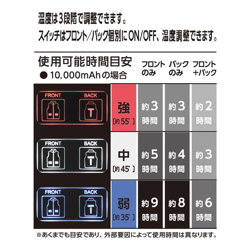 強(約55℃)・中(約45℃)・弱(約35℃)の3段階で温度調節が可能なため、肌寒い屋外・暖房のきいた室内など、冬特有の温度変化に柔軟に対応します。