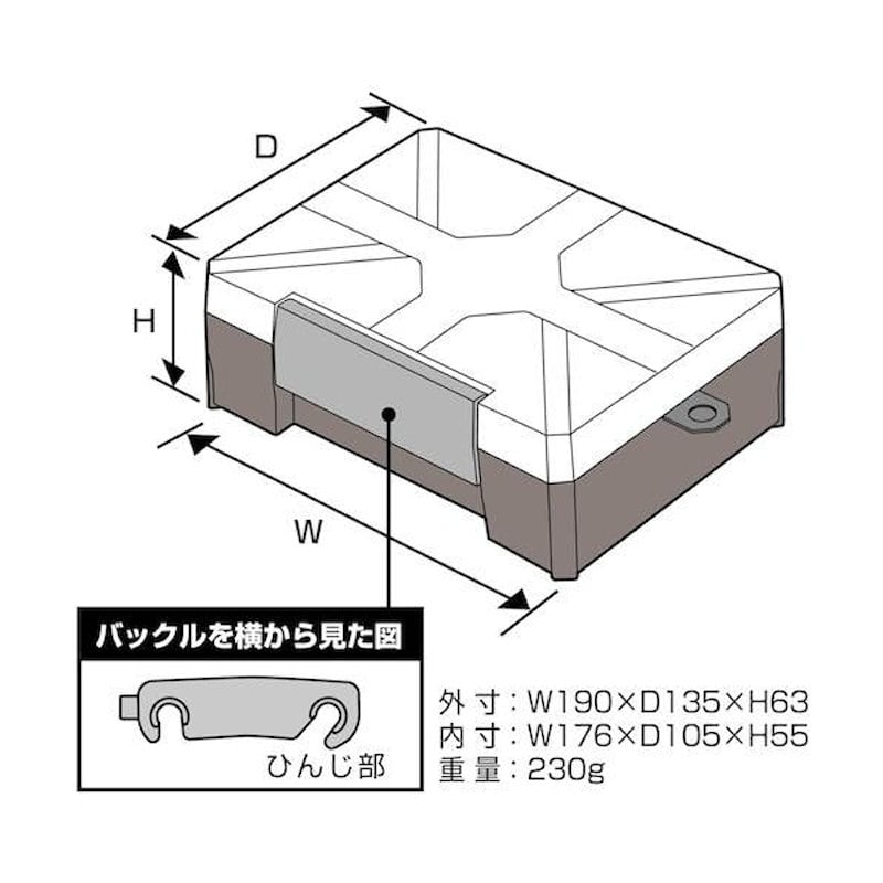 ●1000kgの荷重に耐える(上面全体に荷重をかけた数値) ●バックルを付け替えて開け方2種類 ●積み重ね時に安定するスタッキング溝付 【外 寸】幅190×奥行135×高さ63mm 【内 寸】幅176×奥行105×高さ55mm