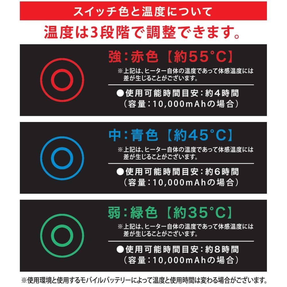 ●温度設定を長時間「強」で使用しないでください。 モバイルバッテリーが熱を持つことがあるため、危険です。