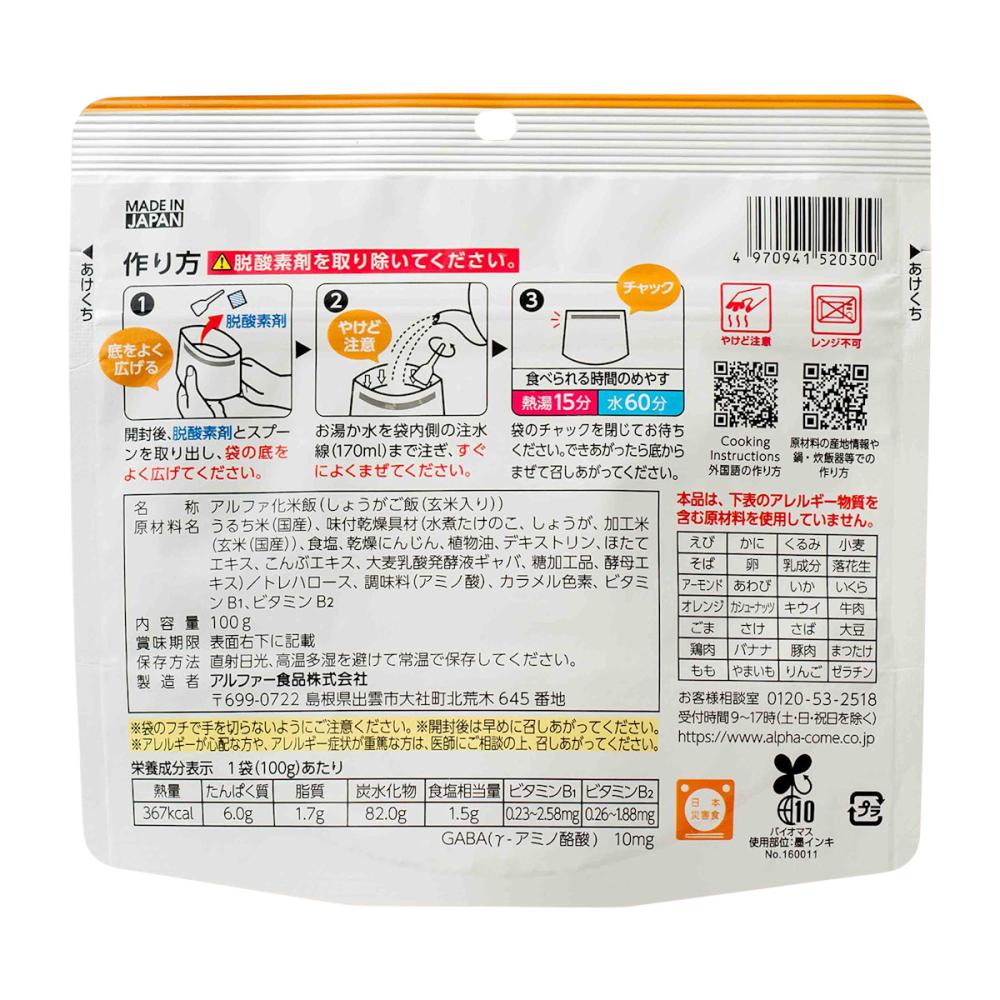 ●国産うるち米100%使用。 ●お湯または水を注ぐだけの簡単調理。(熱湯で15分、水(15度)で60分) ●特定原材料等(アレルギー物質)28品目不使用の食物アレルギーをお持ちの方にも配慮した長期保存食です。 ●賞味期間は製造日から5年10か月です。 ●袋が容器になるので袋のまま食べられます。スプーン付きです。 ●軽量かつコンパクトで携帯性に優れており、キャンプや旅行、山登りのお供にもおすすめです。 ●香ばしい玄米と、ビタミンB1・B2、GABAをプラス。